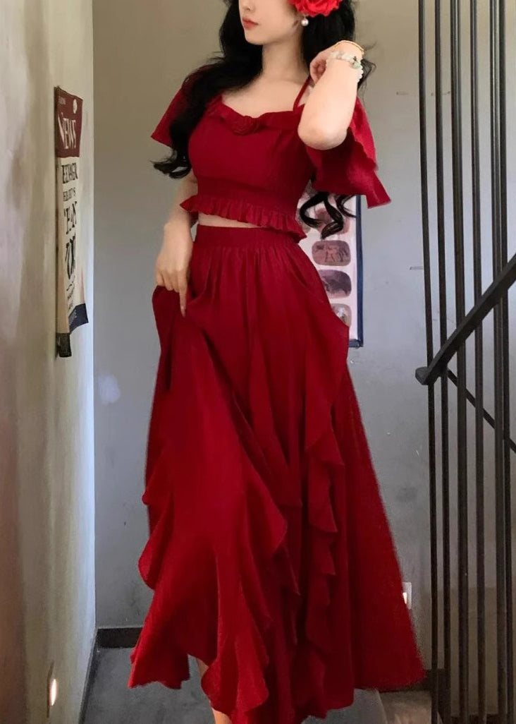 Bohemian Red Ruffled Tops And Skirts Cotton Two Pieces Set Butterfly Sleeve