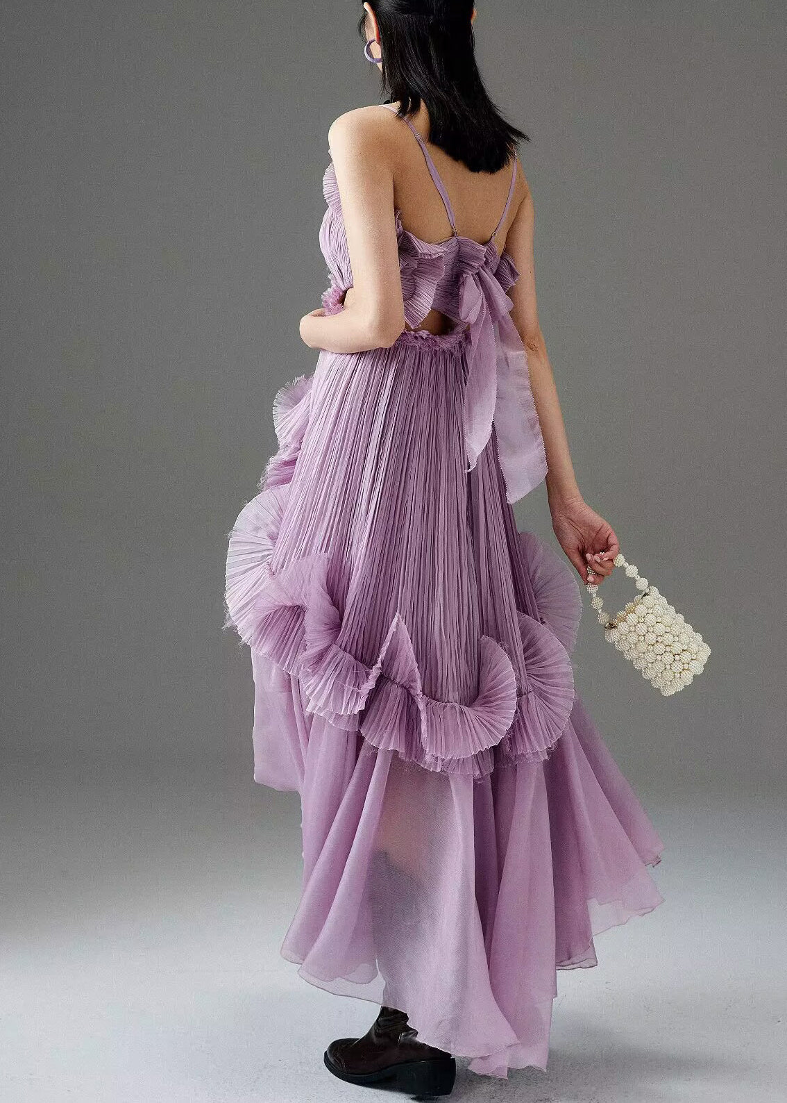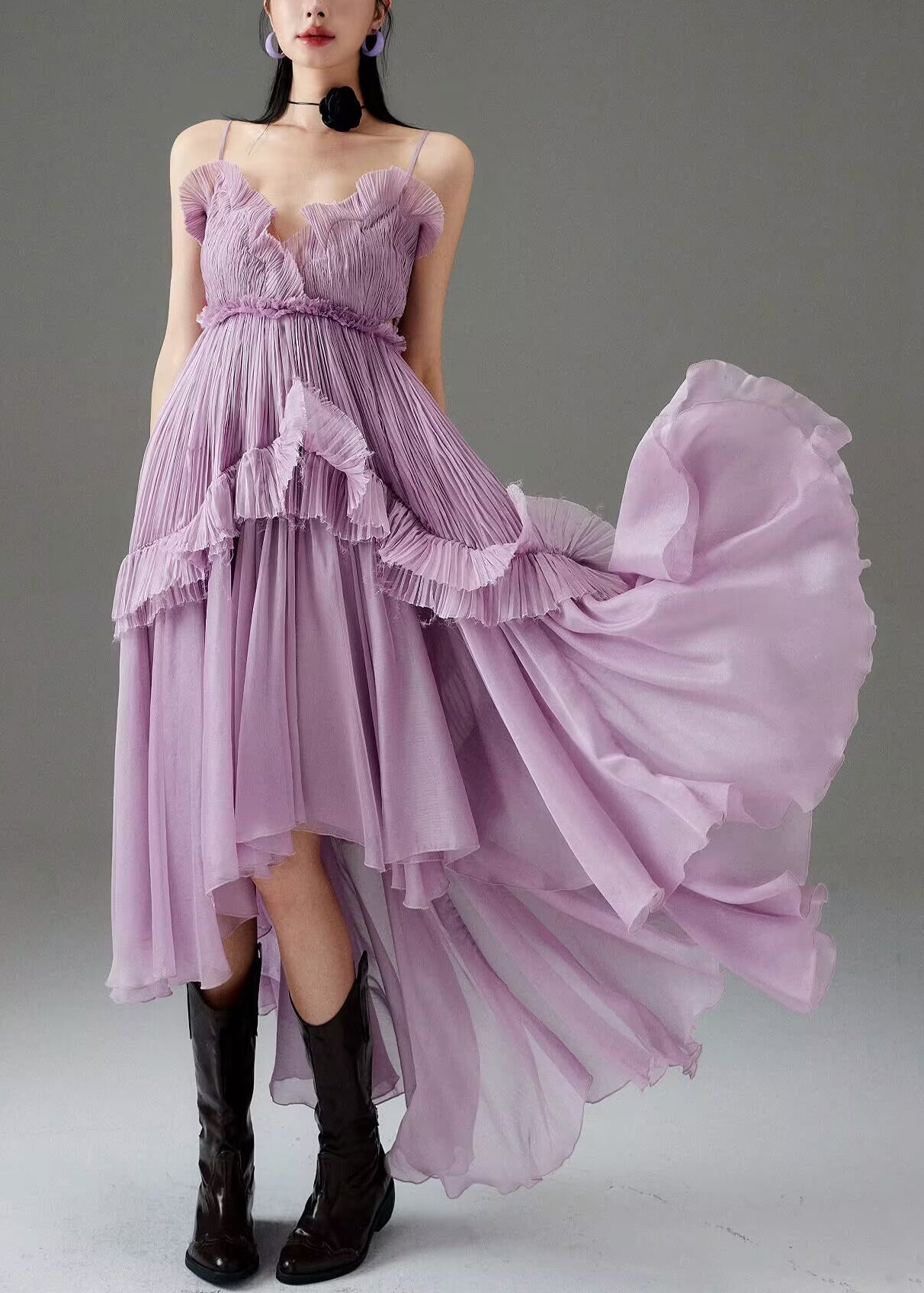 Chic Purple Ruffled Low High Design Chiffon Spaghetti Strap Dress Sleeveless