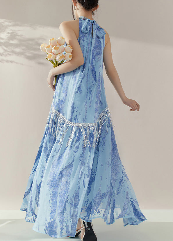 Chinese Style Blue Cold Shoulder Wrinkled Long Dresses Summer