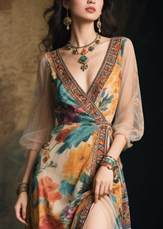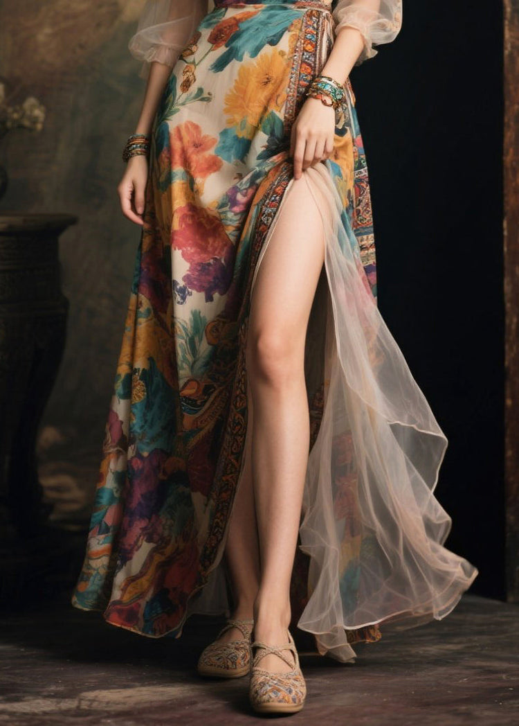 Fine Beige Print Patchwork Side Open Chiffon Vacation Dresses Summer