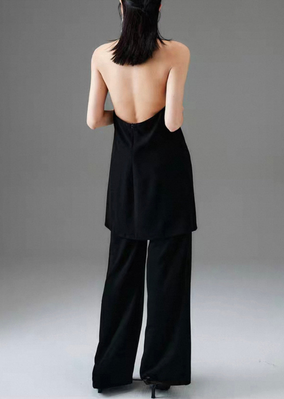 Fine Black Backless Front Open Cotton Two Pieces Set Sleeveless