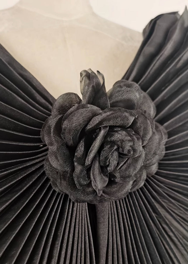 Floral Black V Neck Wrinkled Tulle Long Dress Sleeveless