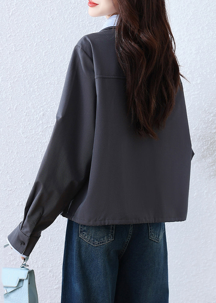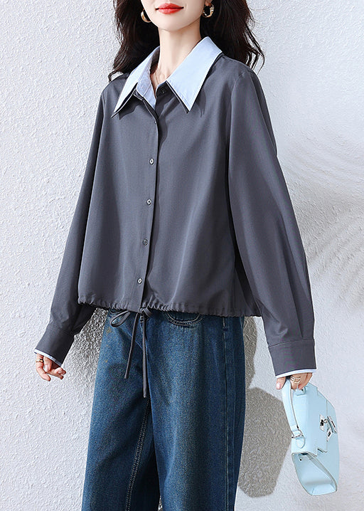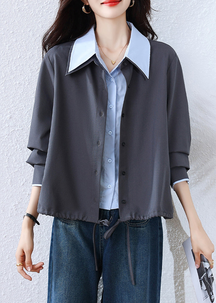 French Grey Button False Two Pieces Patchwork Cotton Blouses Fall