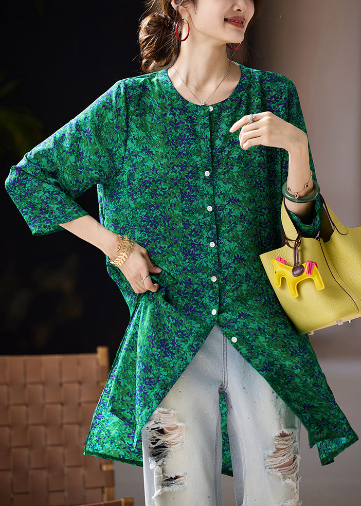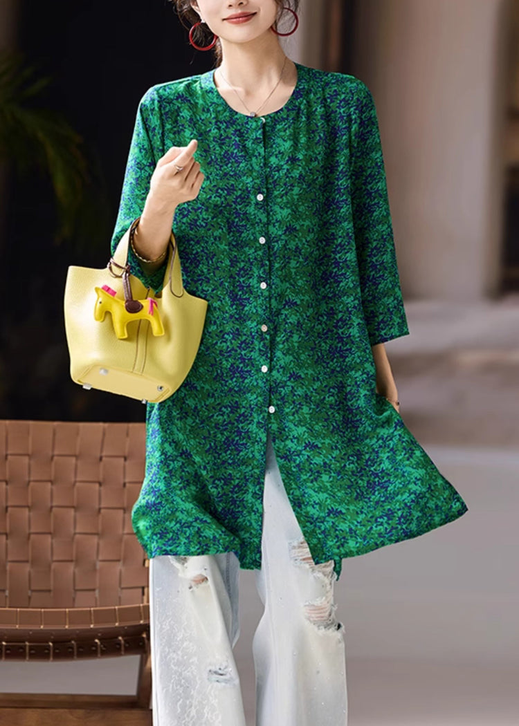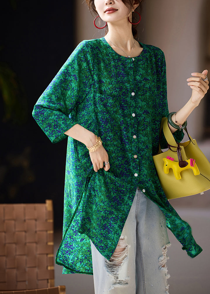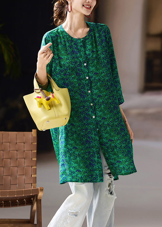 Green Button Side Open Chiffon Blouses O Neck Fall