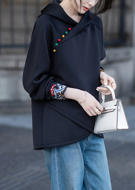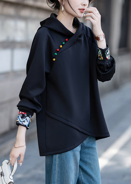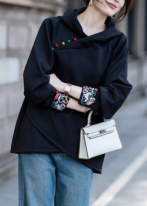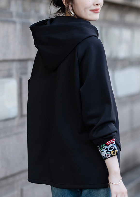 Loose Black Hooded Embroidered Cotton Sweatshirts Fall