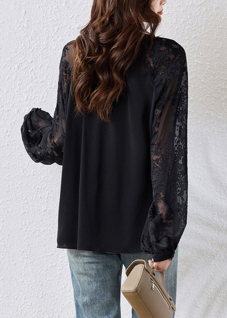 Loose Black V Neck Solid Chiffon Blouses Fall