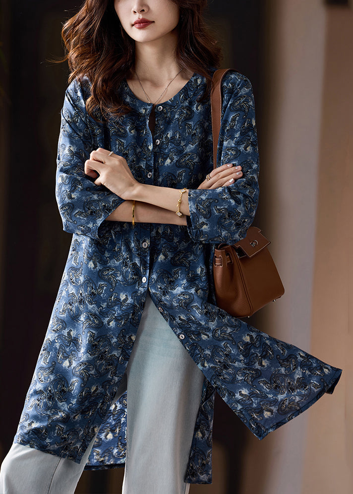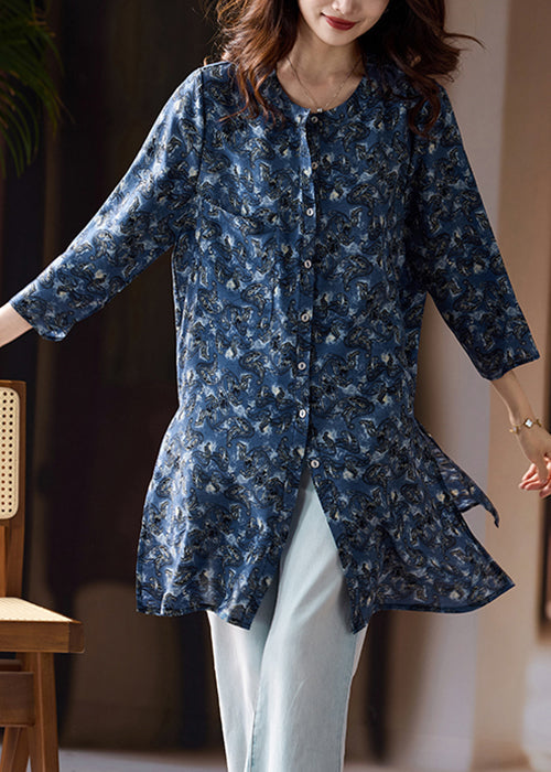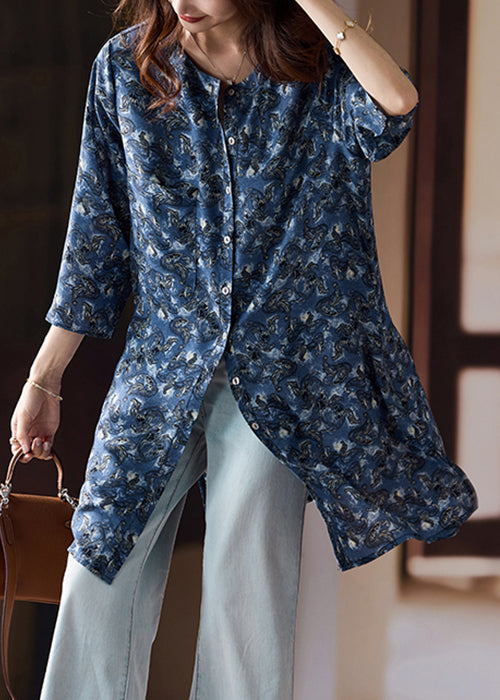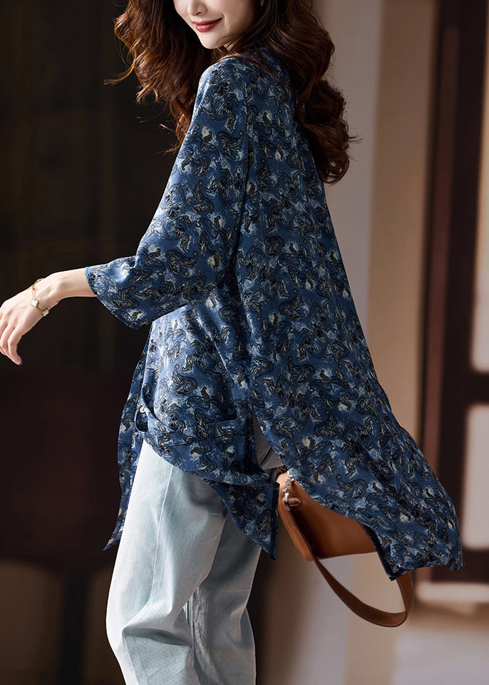 Loose Blue Print Side Open Chiffon Shirts Bracelet Sleeve
