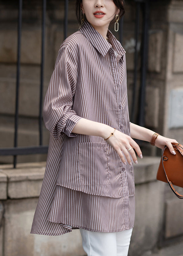 Loose Peter Pan Collar Striped Pockets Cotton Shirt Tops Fall