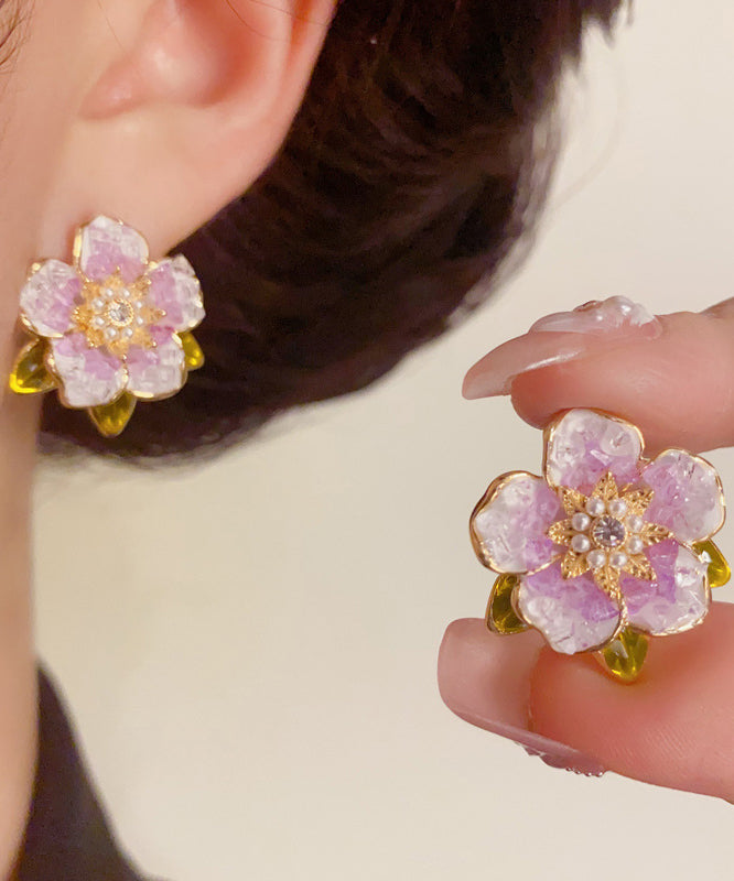 Modern Blue Sterling Silver Overgild Zircon Pearl Camellia Stud Earrings