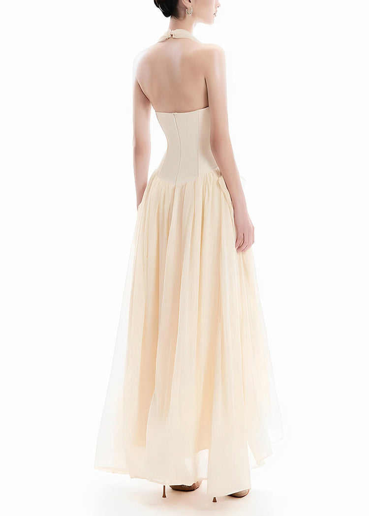 New Apricot V Neck Backless Patchwork Tulle Long Dresses Sleeveless