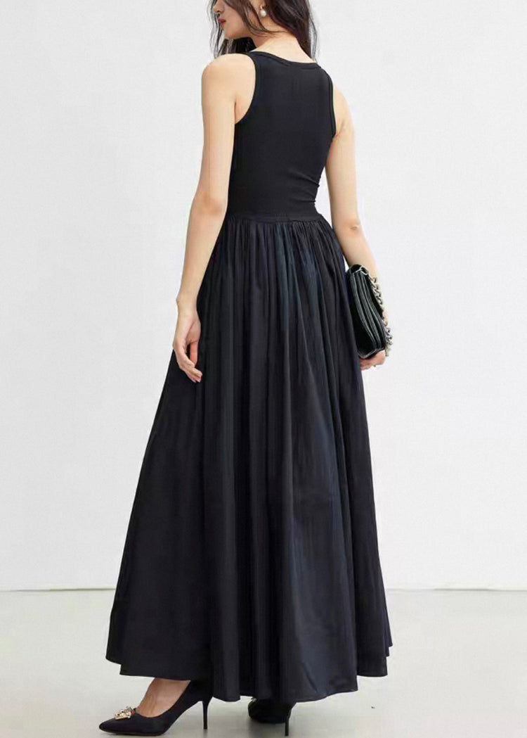 New Black Wrinkled Pockets Cotton Spaghetti Strap Dress Sleeveless