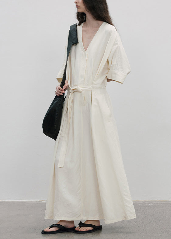 Organic White O Neck Lace Up Wrinkled Cotton Dress Summer