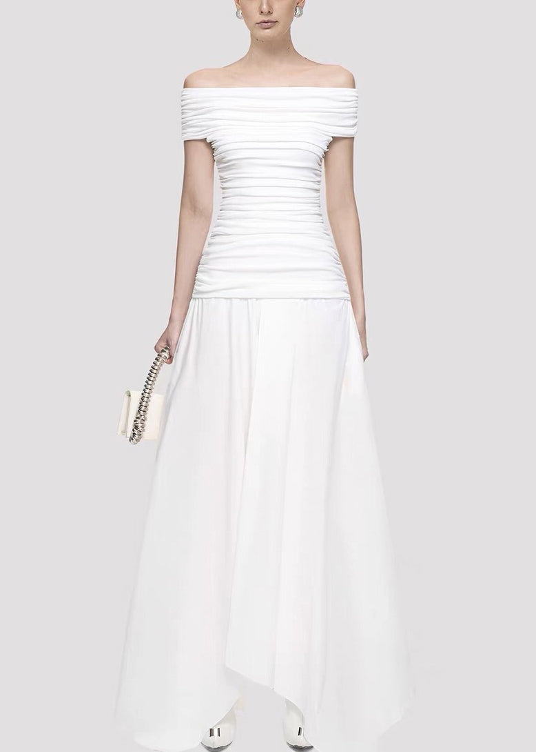 Original White Slash Neck Wrinkled Knitting Cotton Long Dress Summer