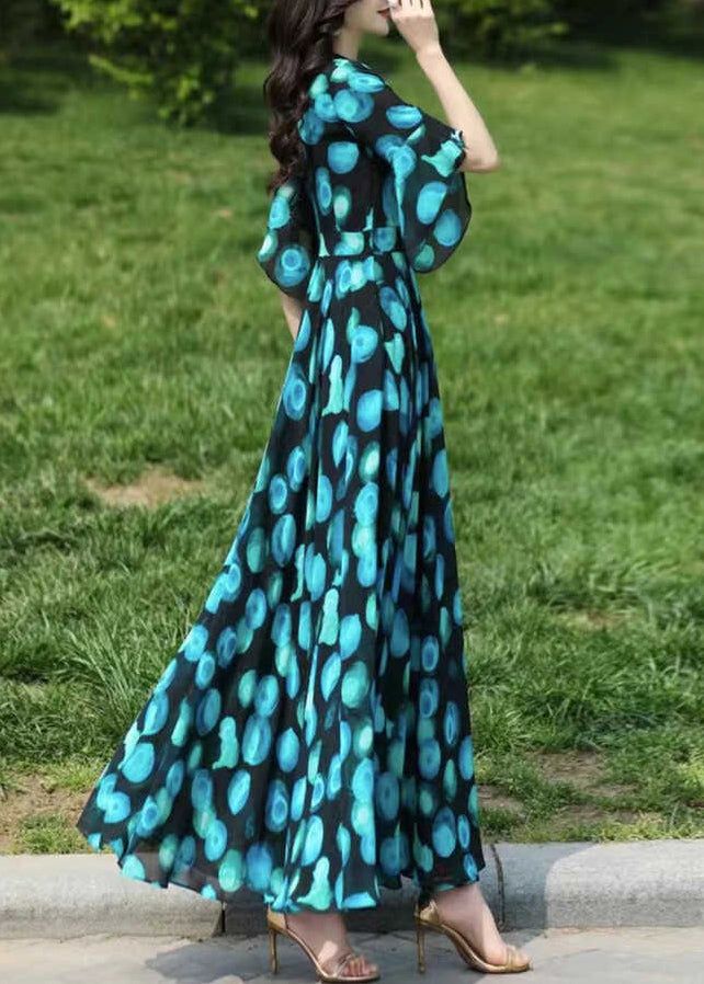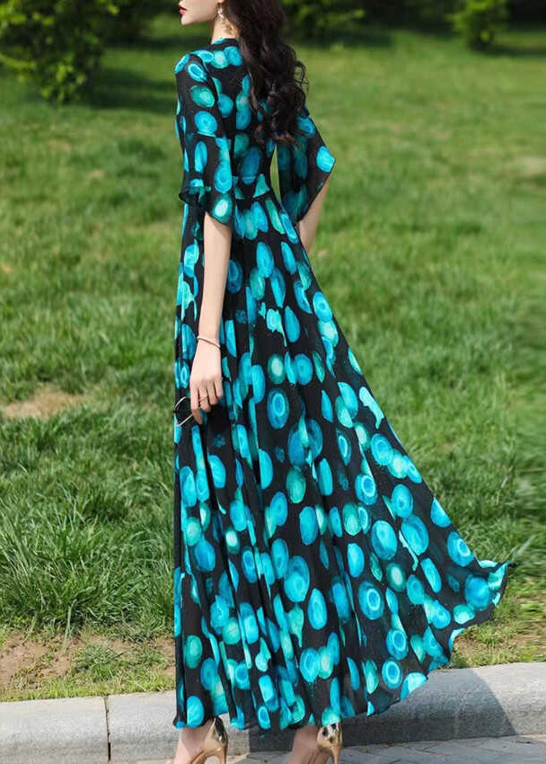 Stylish Blue V Neck Print Chiffon Dresses Flare Sleeve