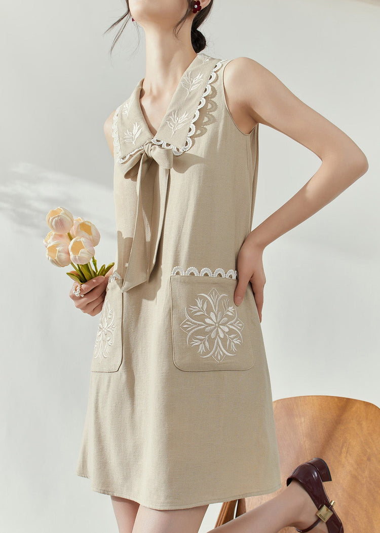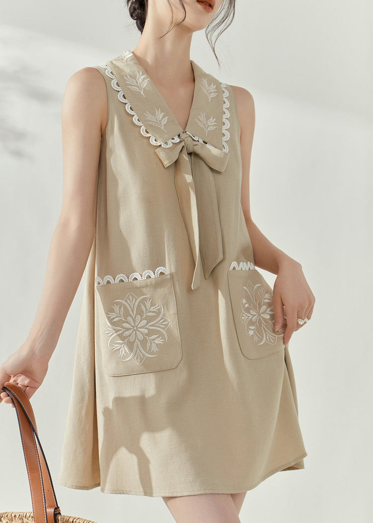 Stylish Khaki Peter Pan Collar Bow Print Mid Dress Sleeveless