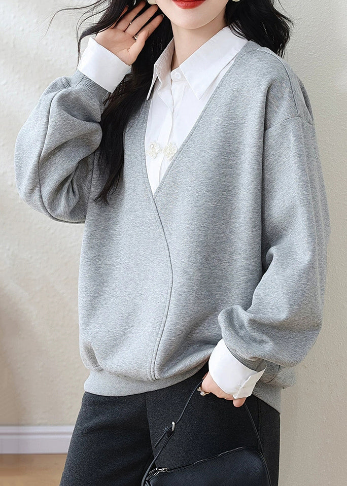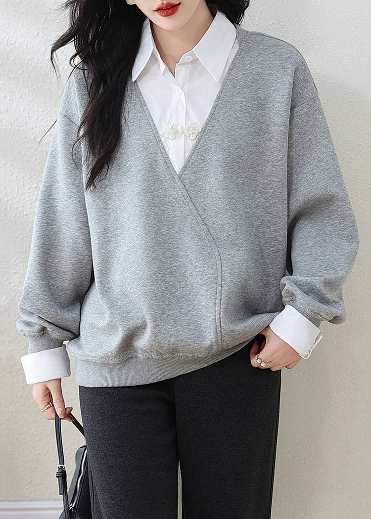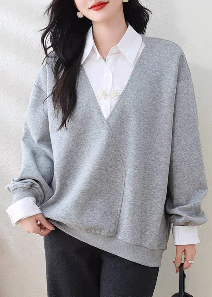 Women Grey Peter Pan Collar False Two Pieces Patchwork Cotton Sweatshirt Fall