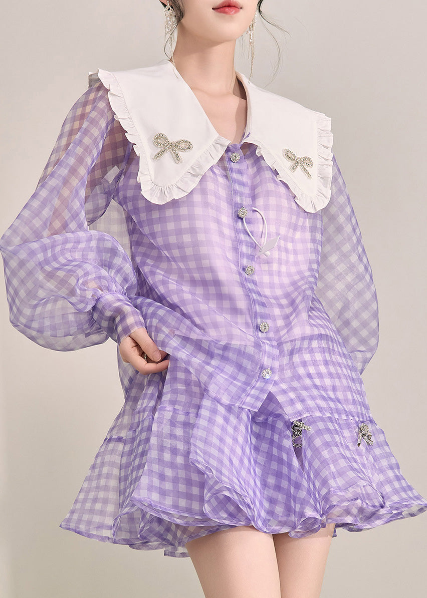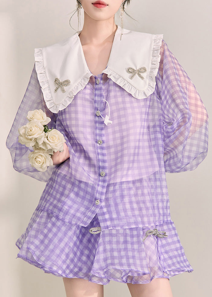Art Purple Plaid Button Tulle Shirts And Shorts Two Pieces Set Fall