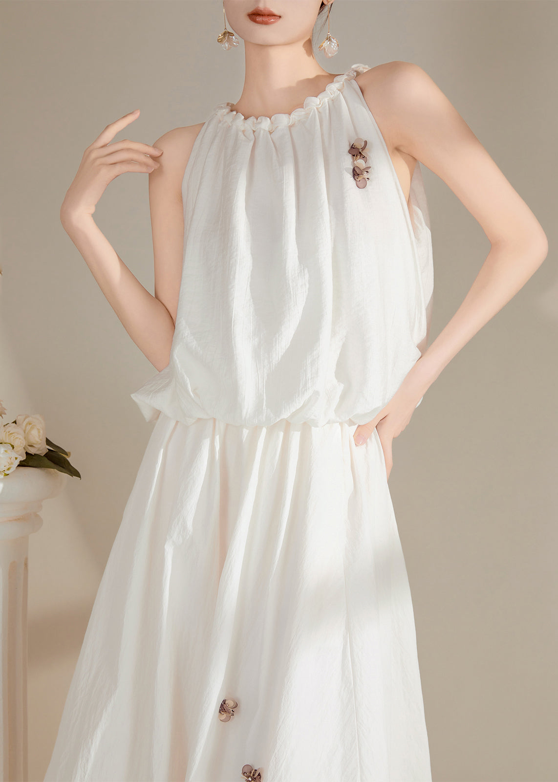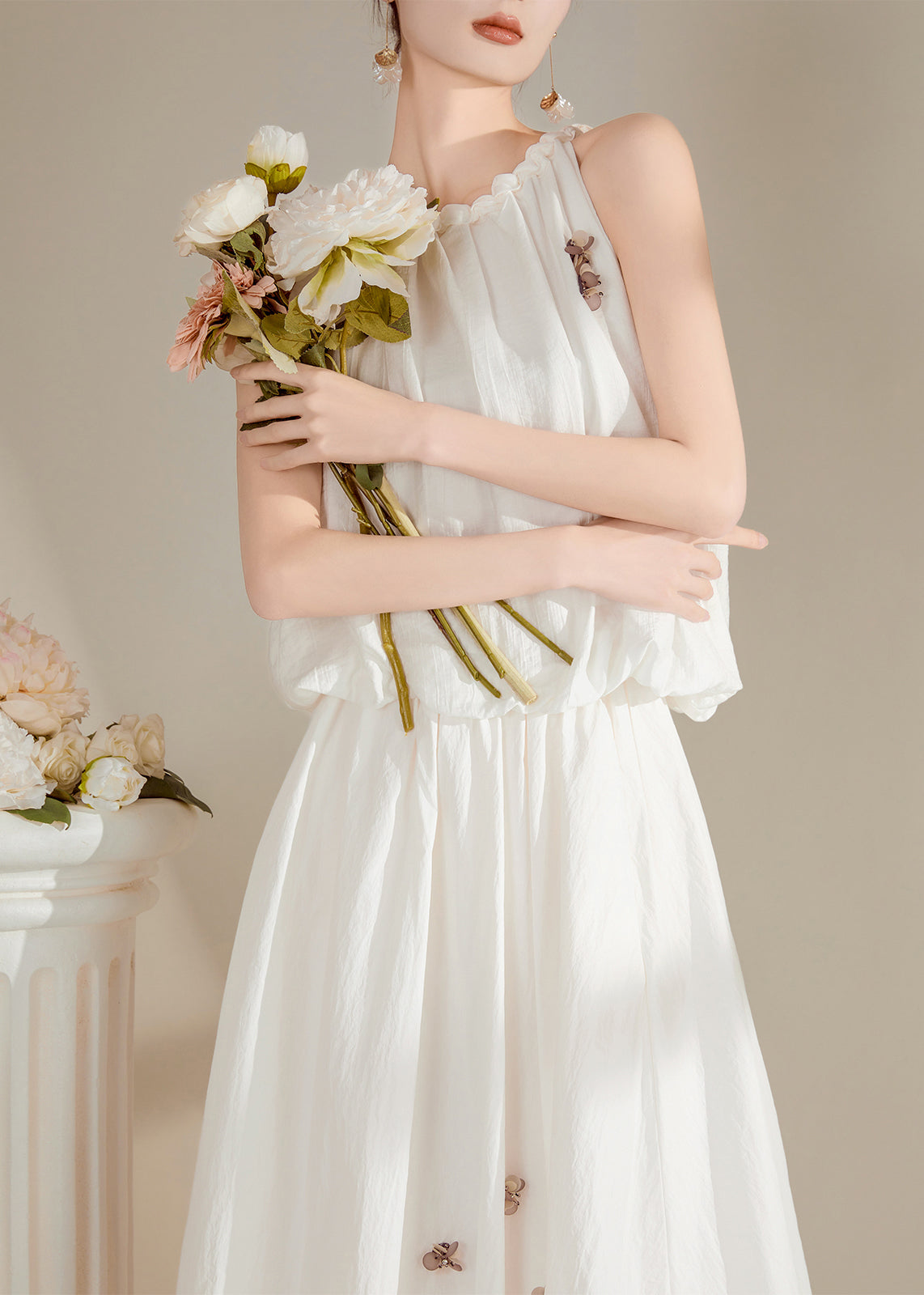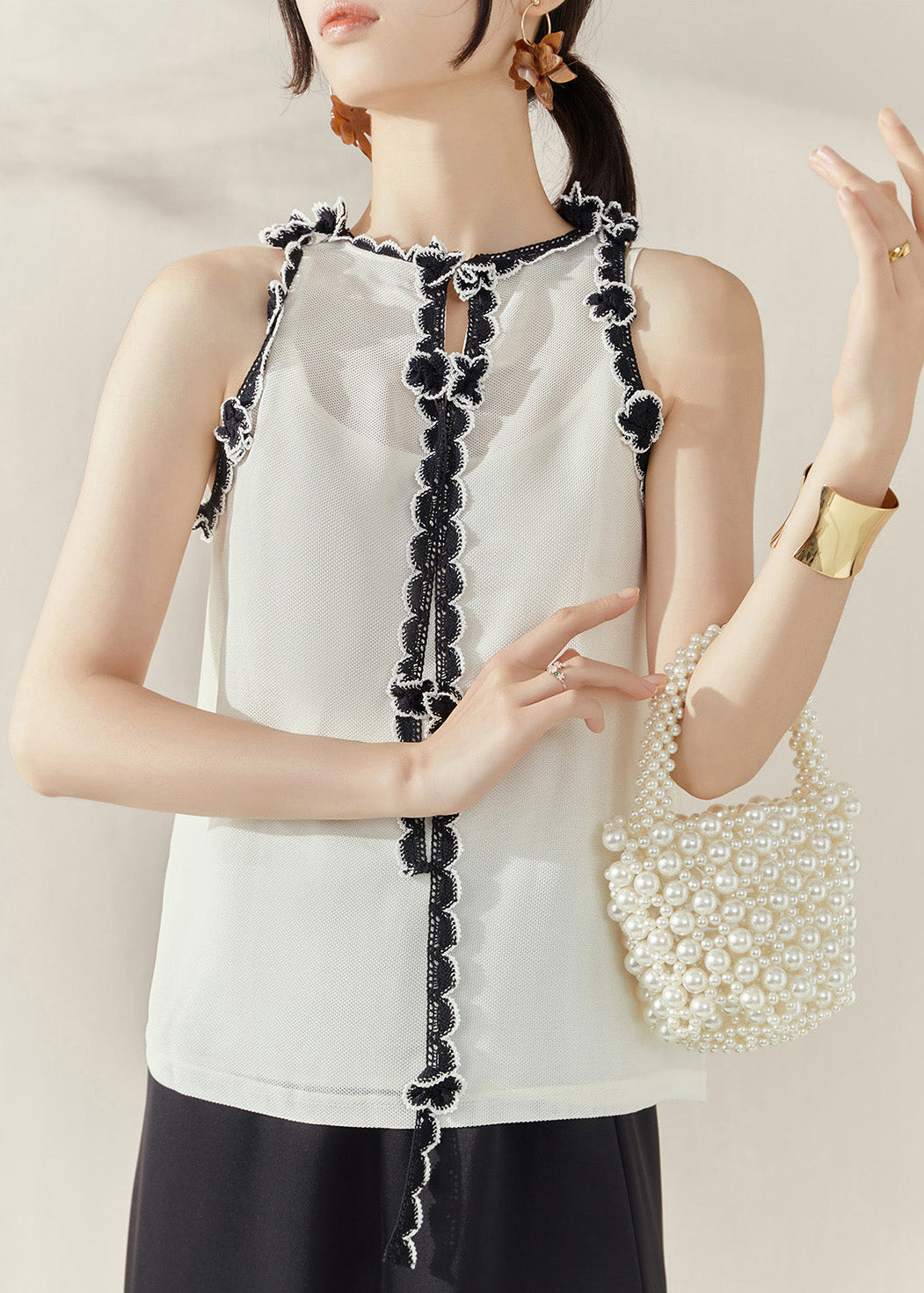 Chic White Floral Ruffled Patchwork Tops Sleeveless