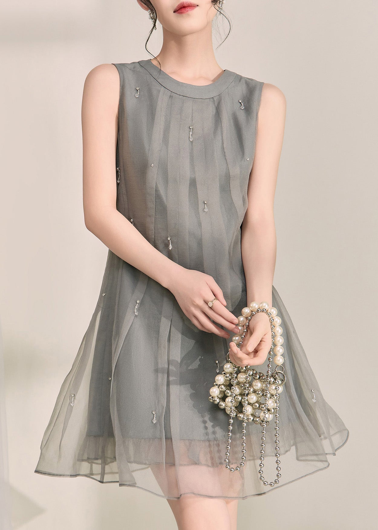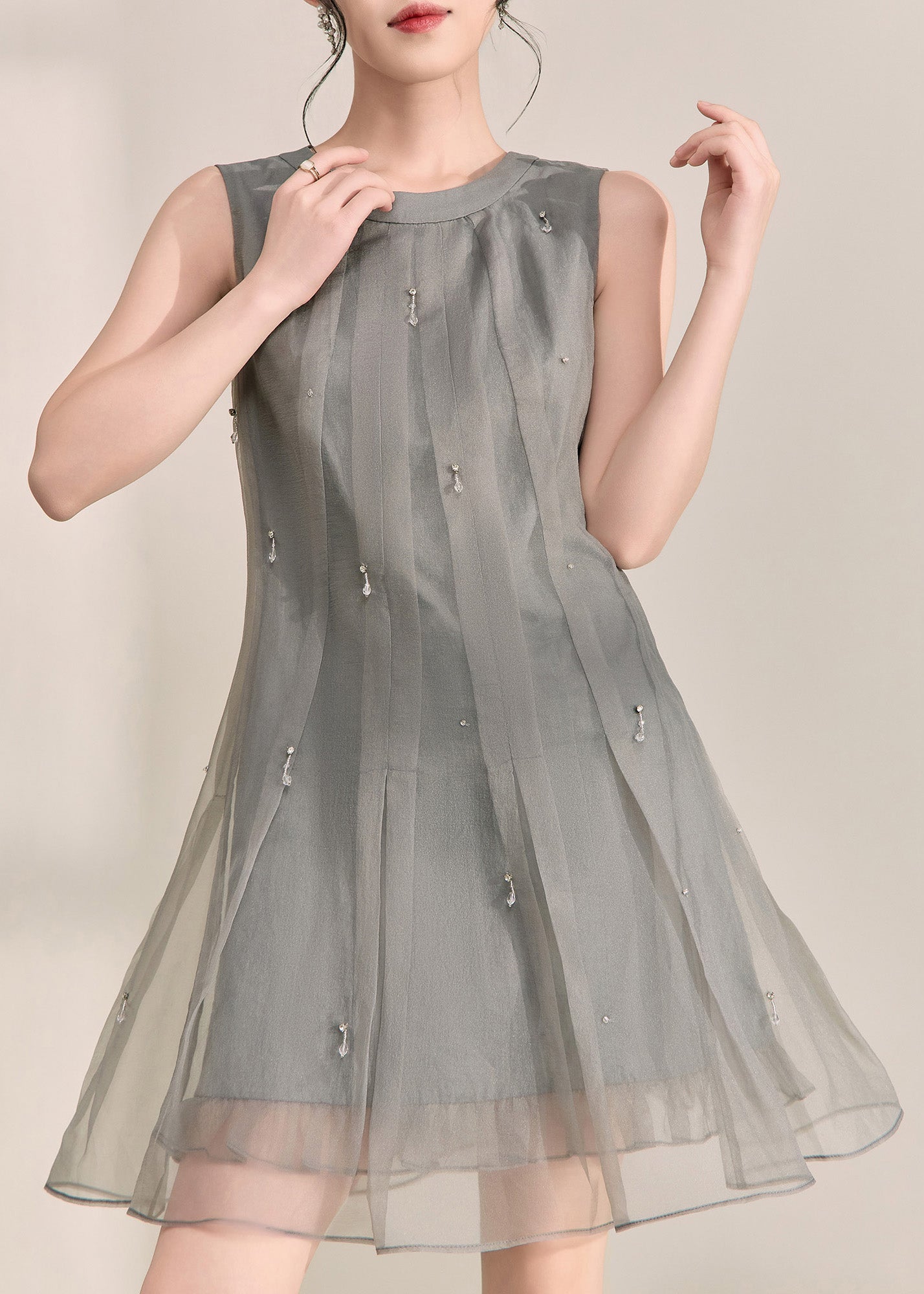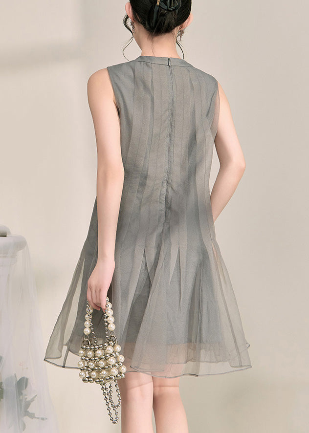 Boutique Grey O-Neck Patchwork Tulle Mid Dress Summer