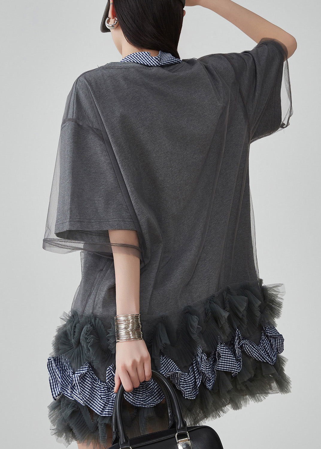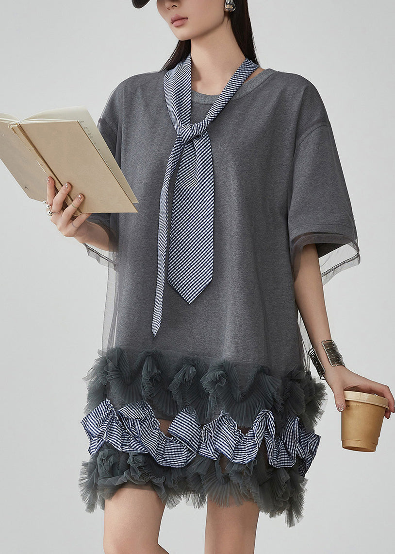 Casual Grey Ruffled Tulle Patchwork Fake Two Pieces Mid Dress Short Sleeve