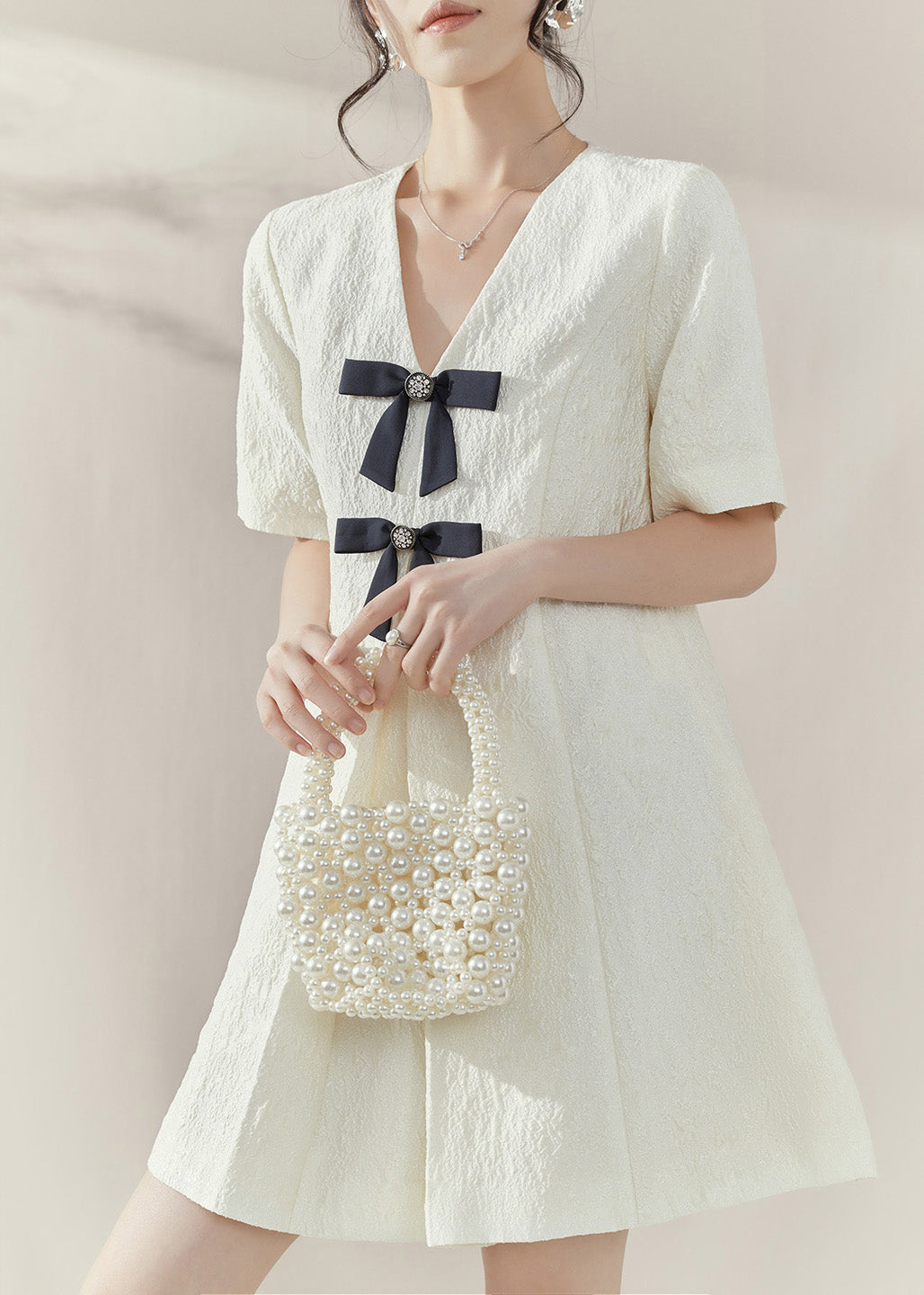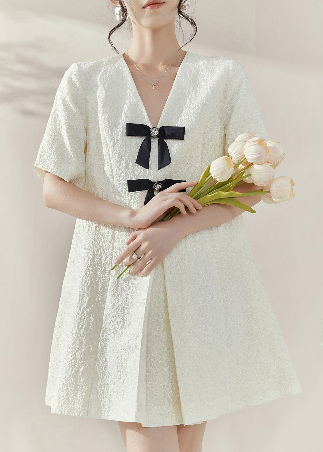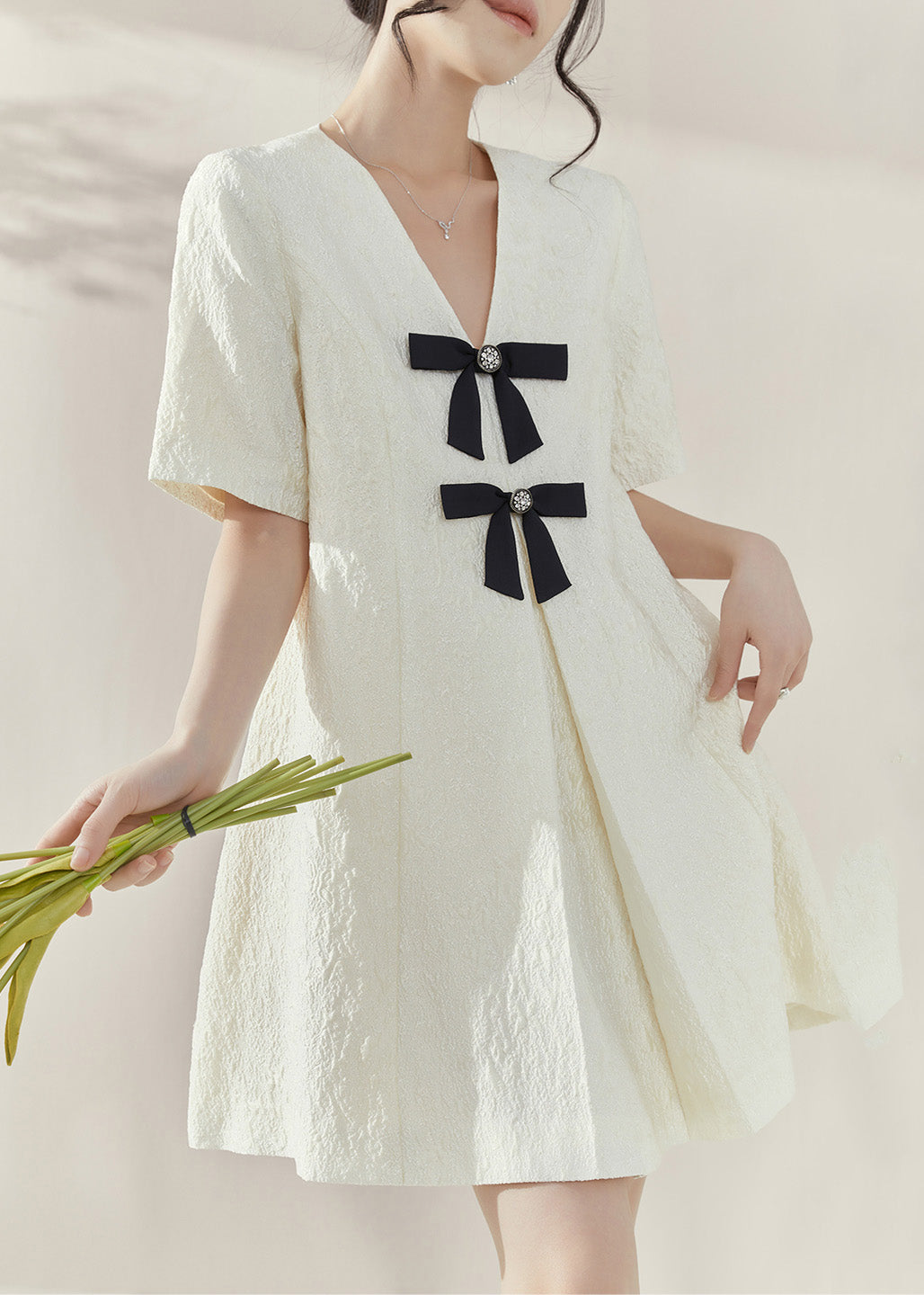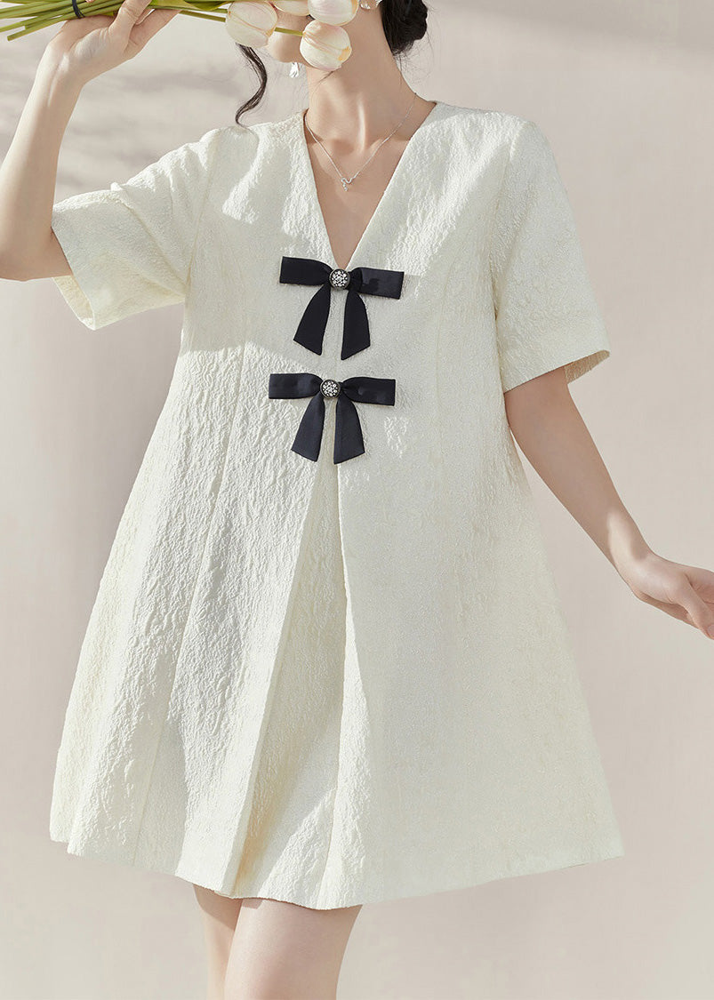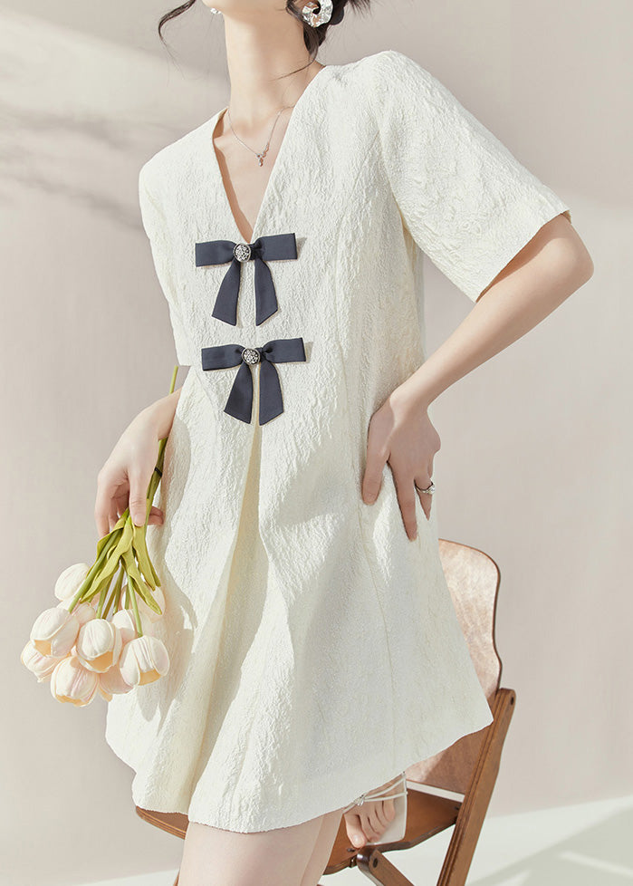 Classy White V Neck Bow Mid Dresses Short Sleeve
