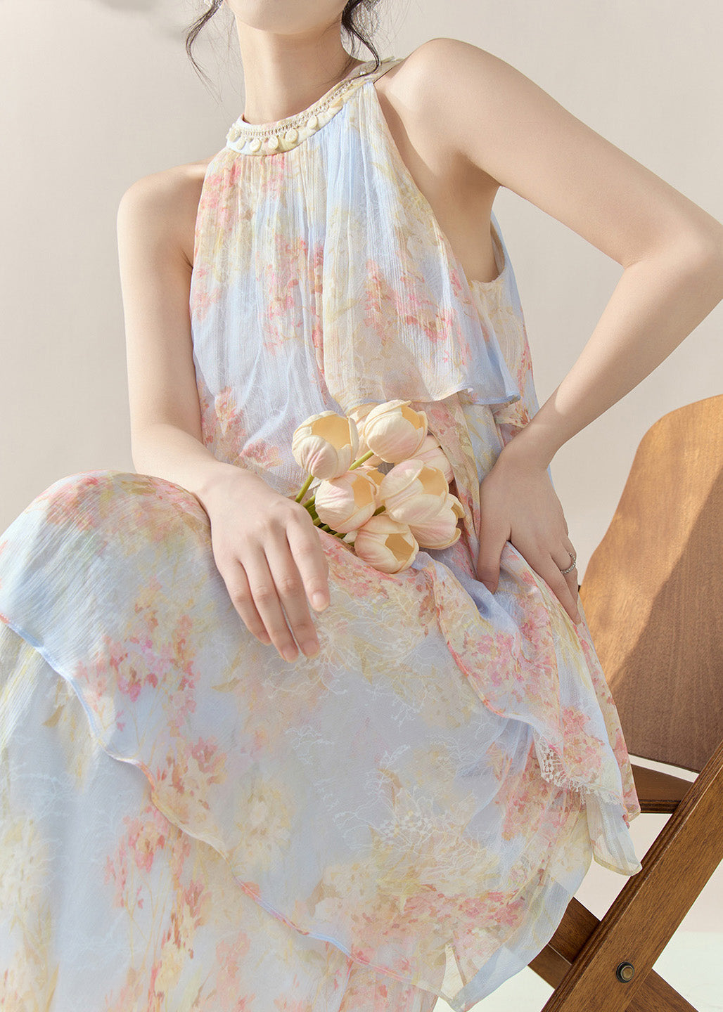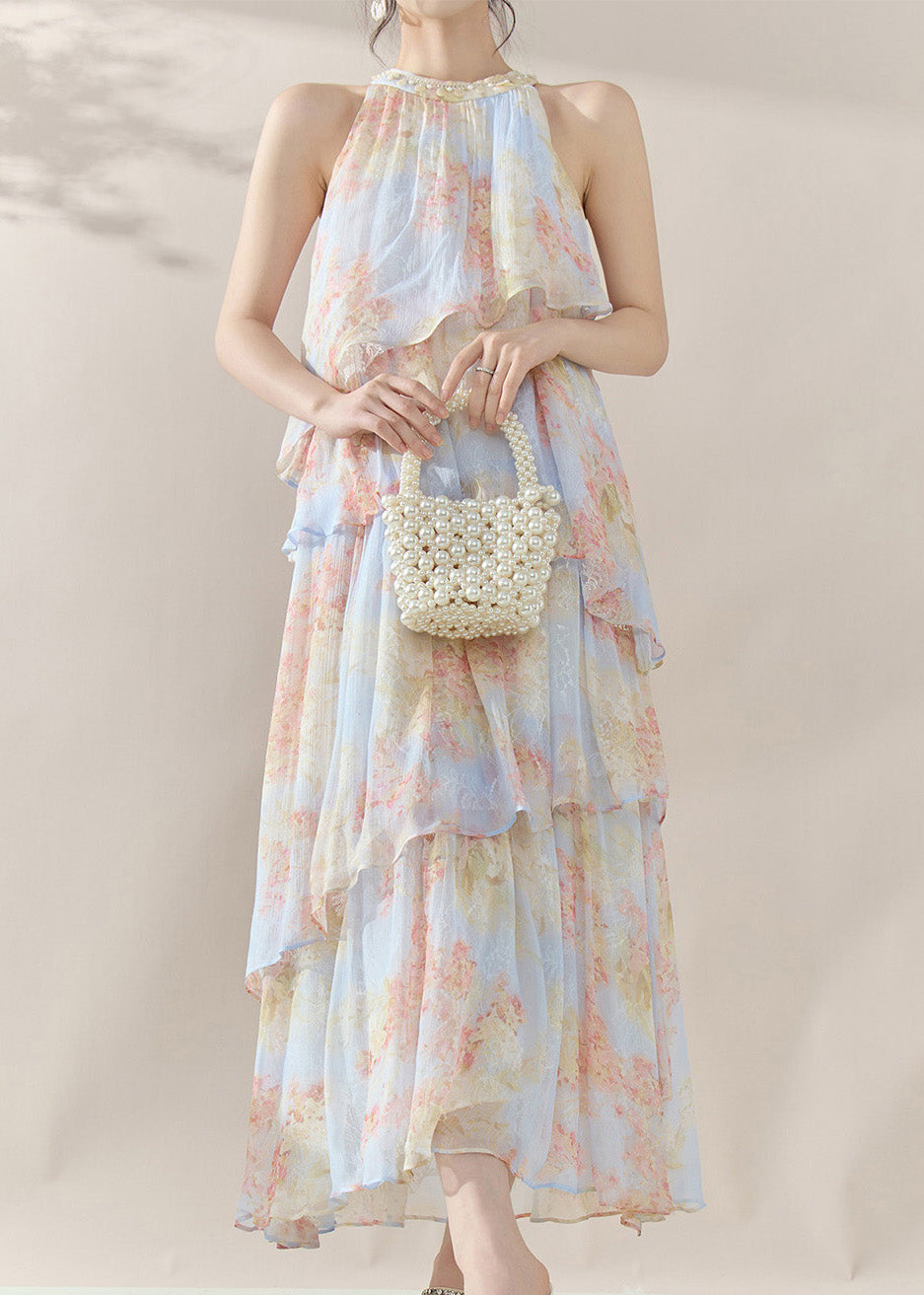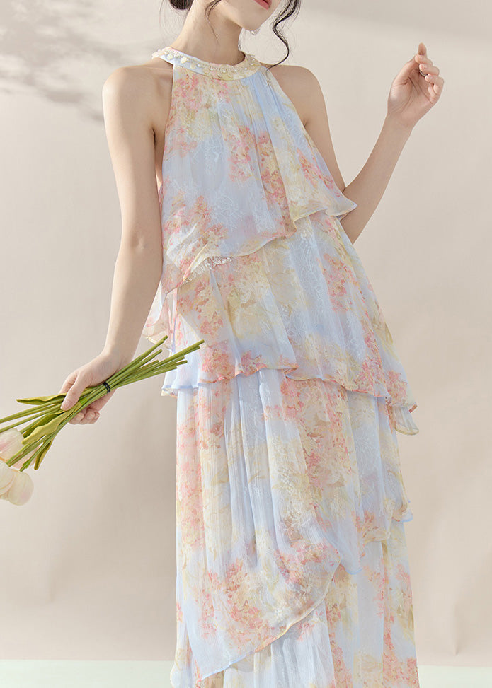 Fine Blue Halter Print Chiffon Long Dresses Summer