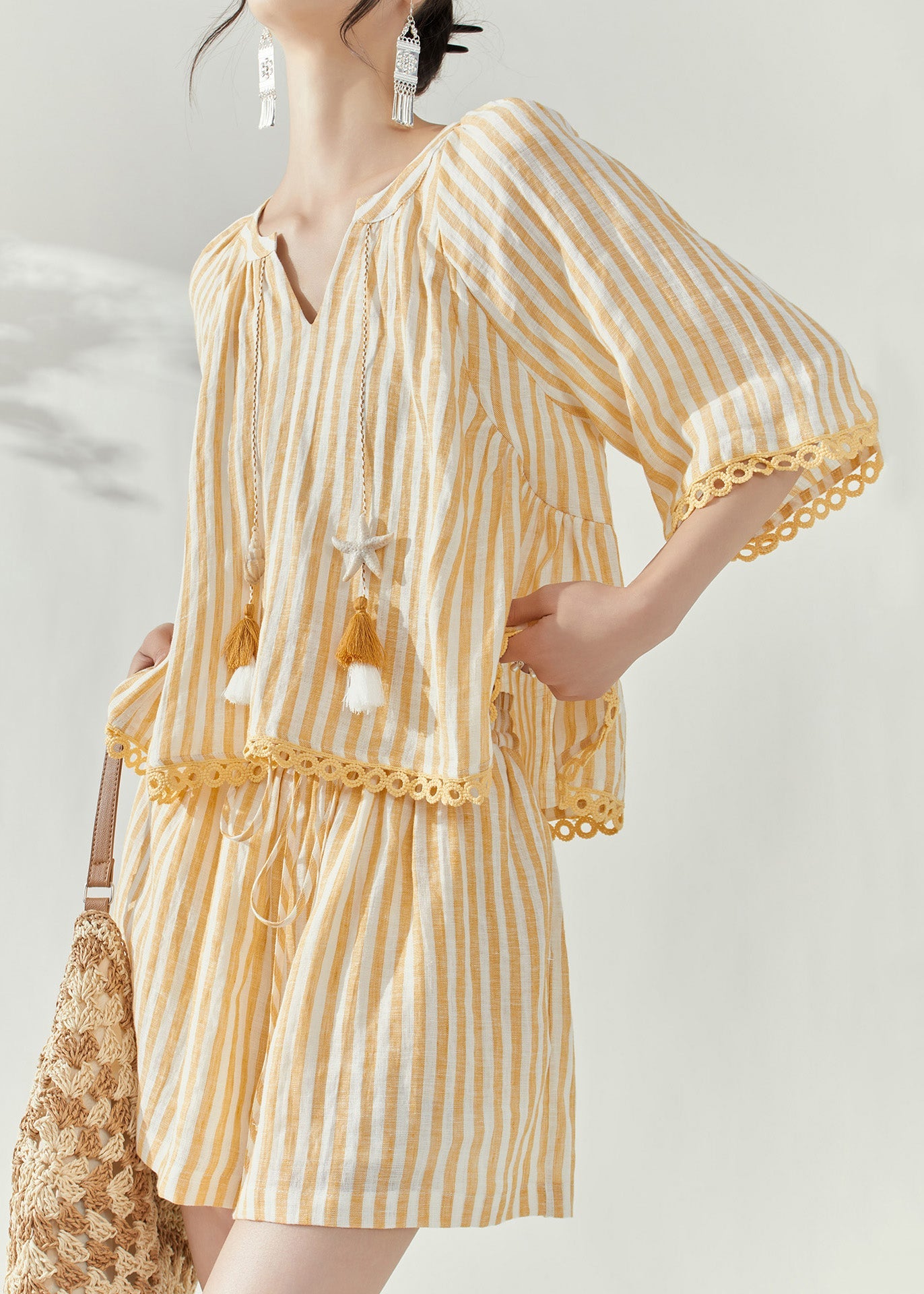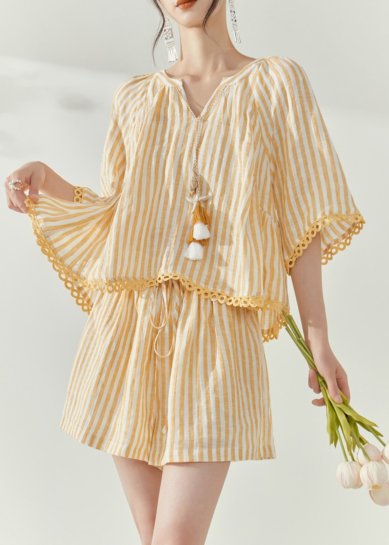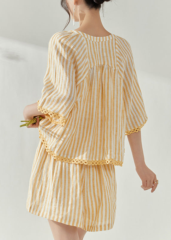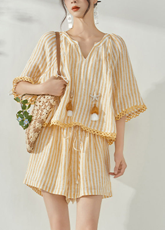 Modern Yellow Striped Top And Shorts Two-Piece Set Short Sleeve
