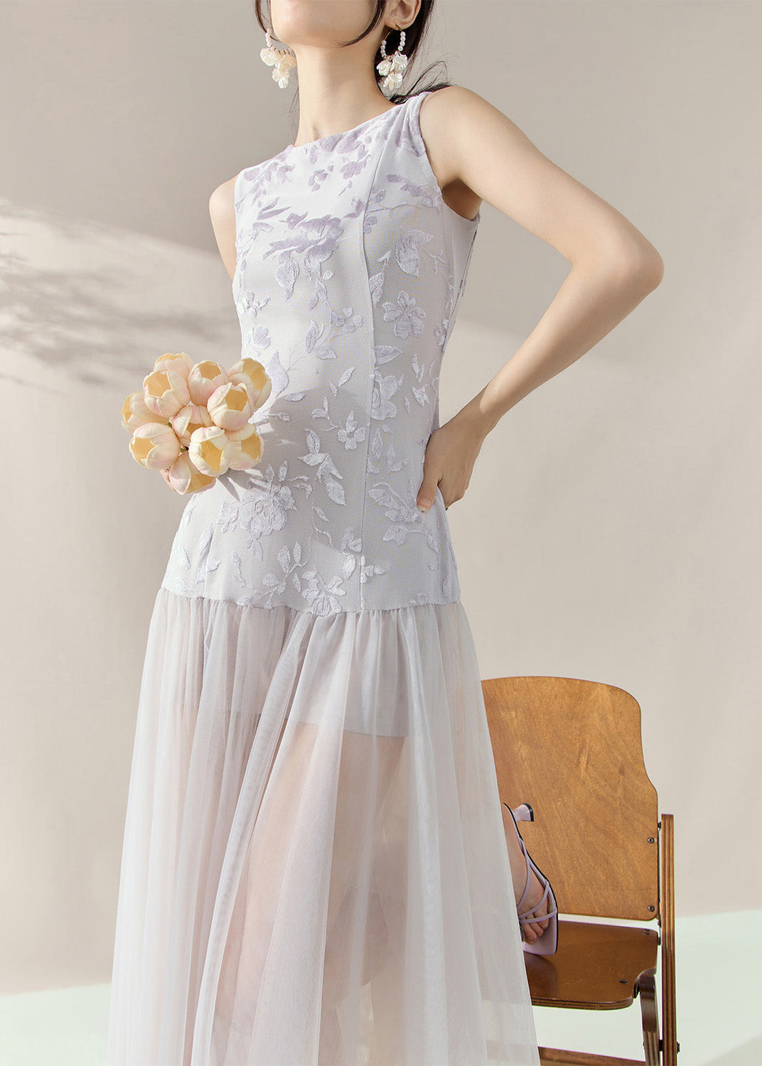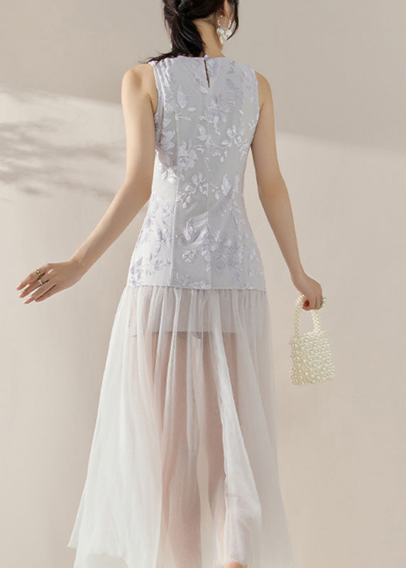 Natural Colorblock Print Tulle Patchwork Long Dress Sleeveless
