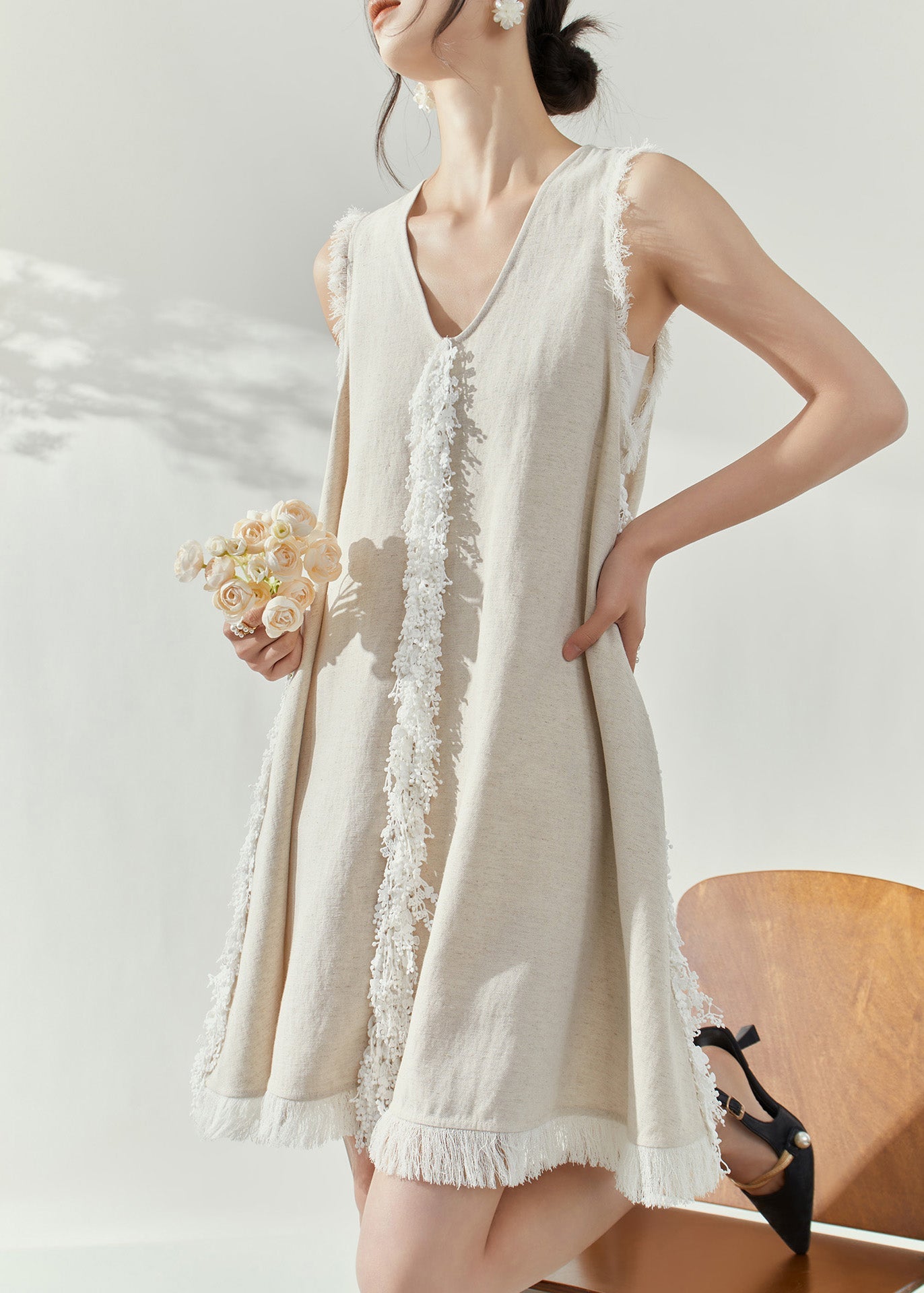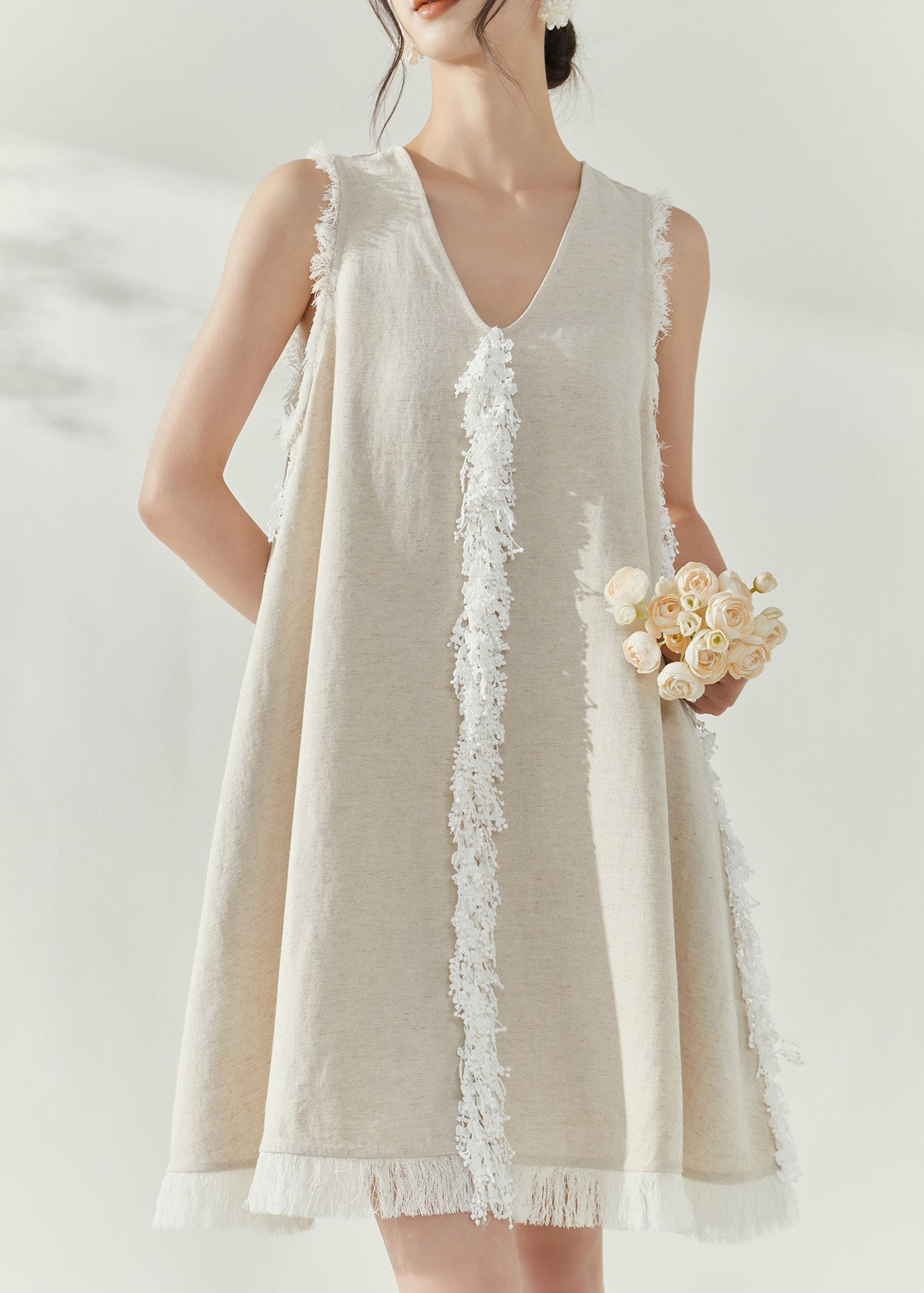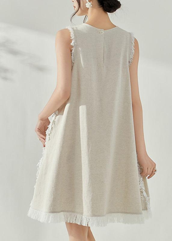 Vintage Beige V Neck Tassel Vacation Mid Dresses Sleeveless