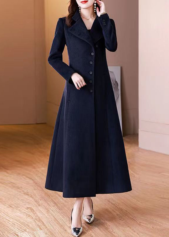 Elegant Navy Peter Pan Collar Button Woolen Long Coat Winter