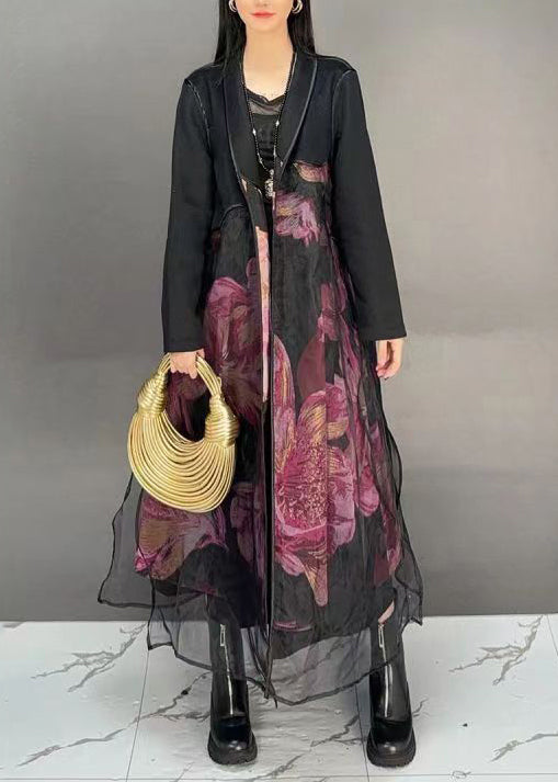 French Black Print Tulle Patchwork Long Coats Fall