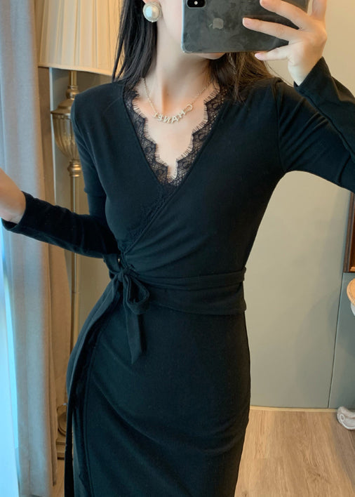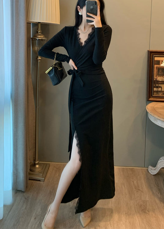 DIY Black Tie Waist Patchwork Eyelash Side Open Long Dresses
