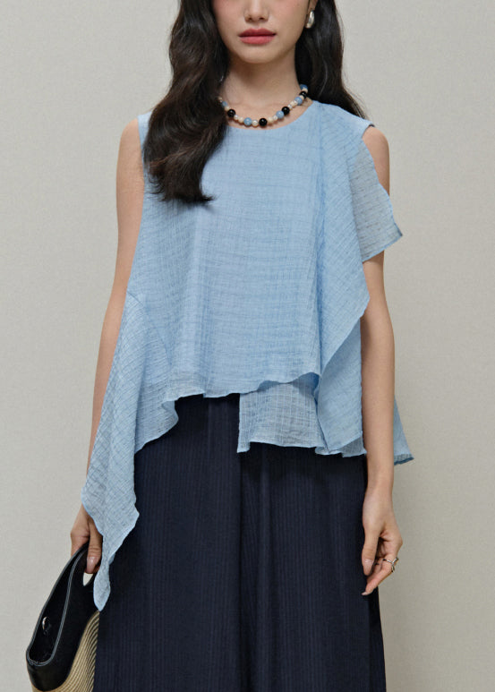 New Light Blue Asymmetrical Solid Cotton Top Sleeveless