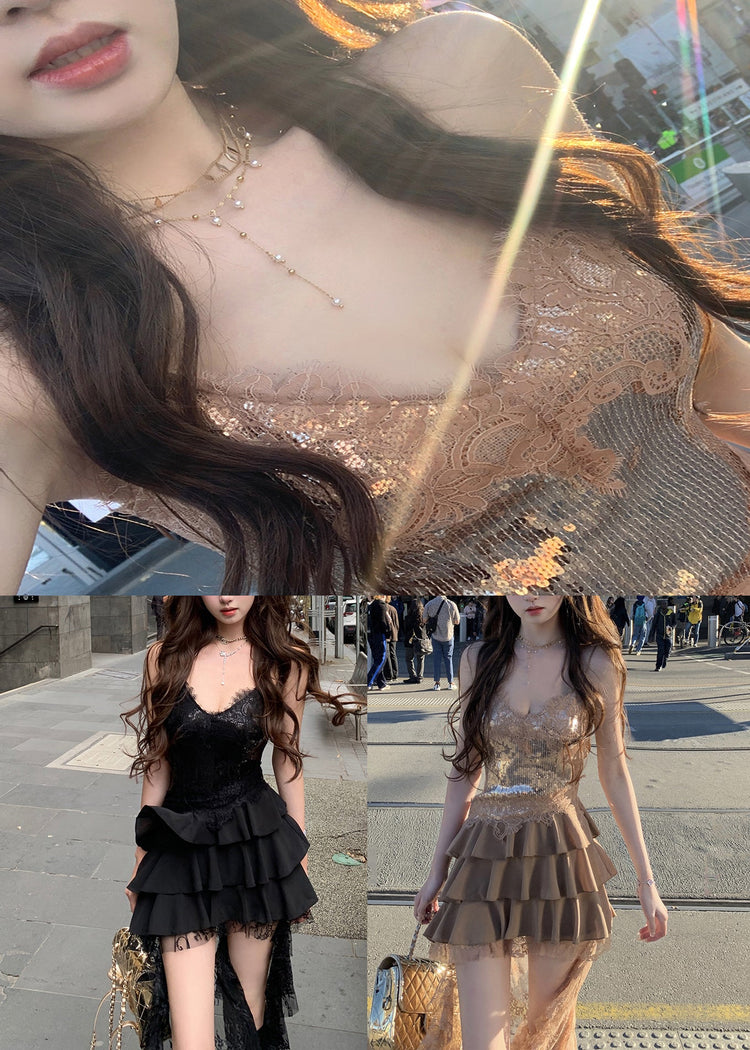 Sexy Black Sequins Lace Low High Design Dress Sleeveless