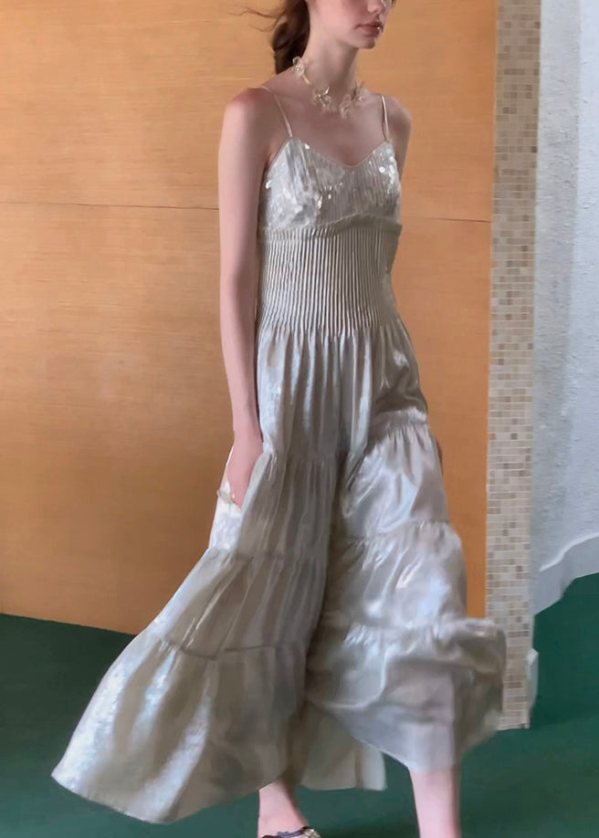 Stylish Silver V Neck Sequins Wrinkled Chiffon Spaghetti Strap Dress Sleeveless