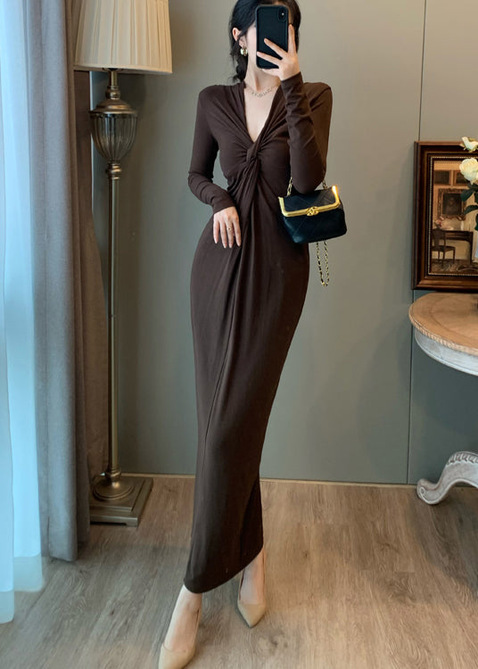 Silm Fit Chocolate V Neck Wrinkled Cotton Straight Dress Fall