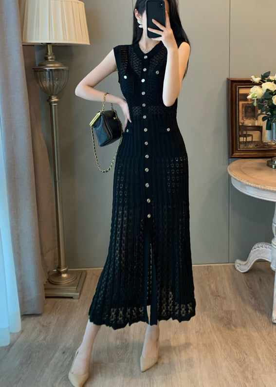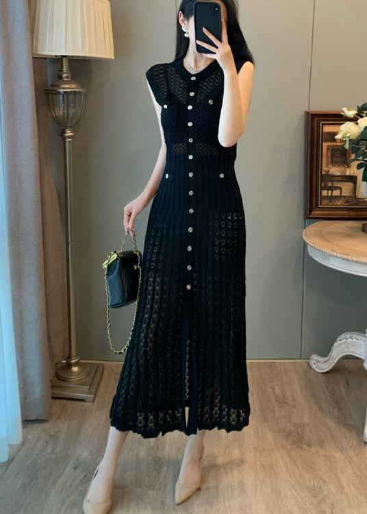 Women Black Hollow Out Single Breasted Buttons Knit Long Dress Sleeveless