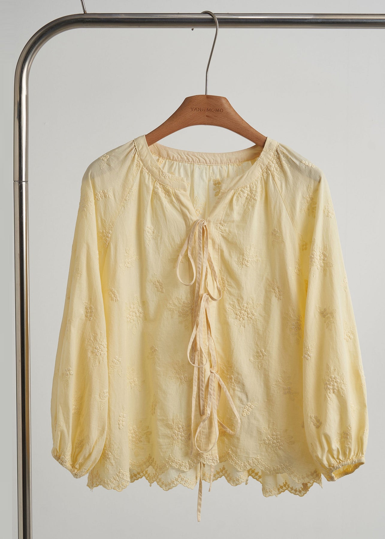 Women Yellow Embroidered Lace Up Cotton Shirt Top Fall