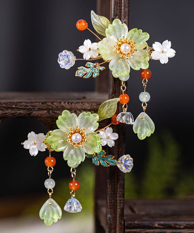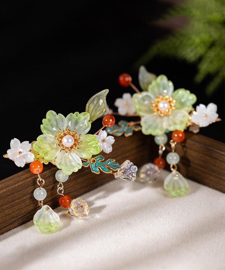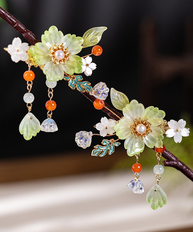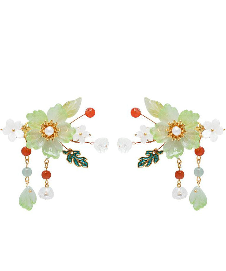 Chinese Style Multicolor Copper Overgild Pearl Coloured Glaze Leaf A Pair Hairpin