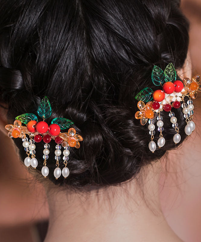 Vintage Rainbow Copper Overgild Pearl Hawthorn Leaf Tassel A Pair Hairpin