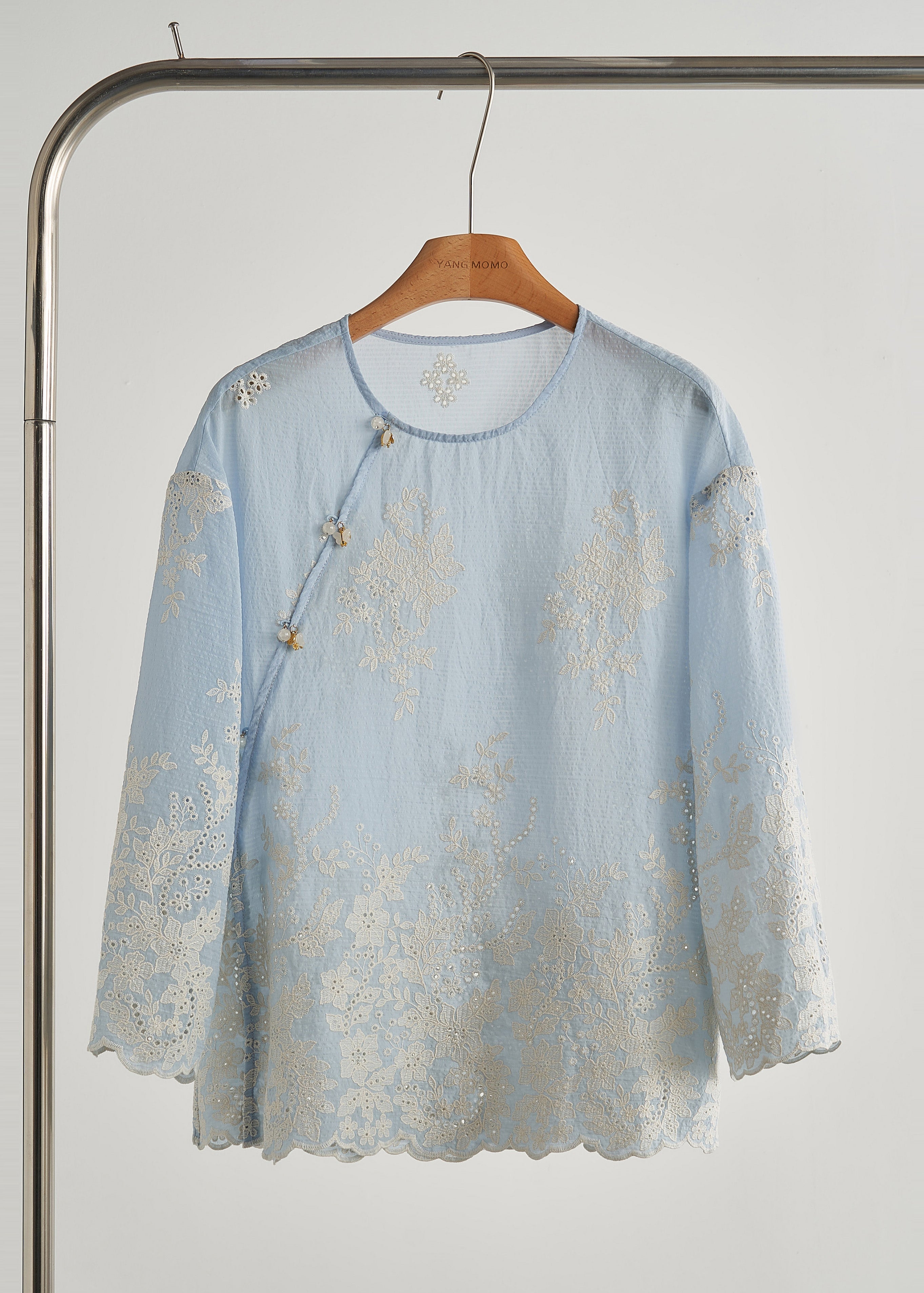 Chic Sky Blue Embroidered Hollow Out Cotton Top Fall
