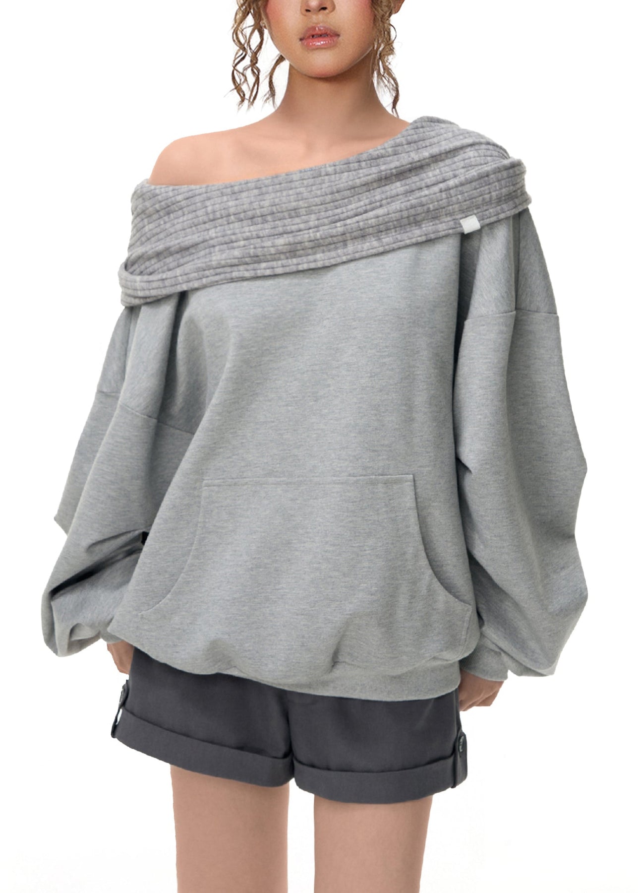 Chic Grey Cold Shoulder Patchwork Cotton Sweatshirt Fall