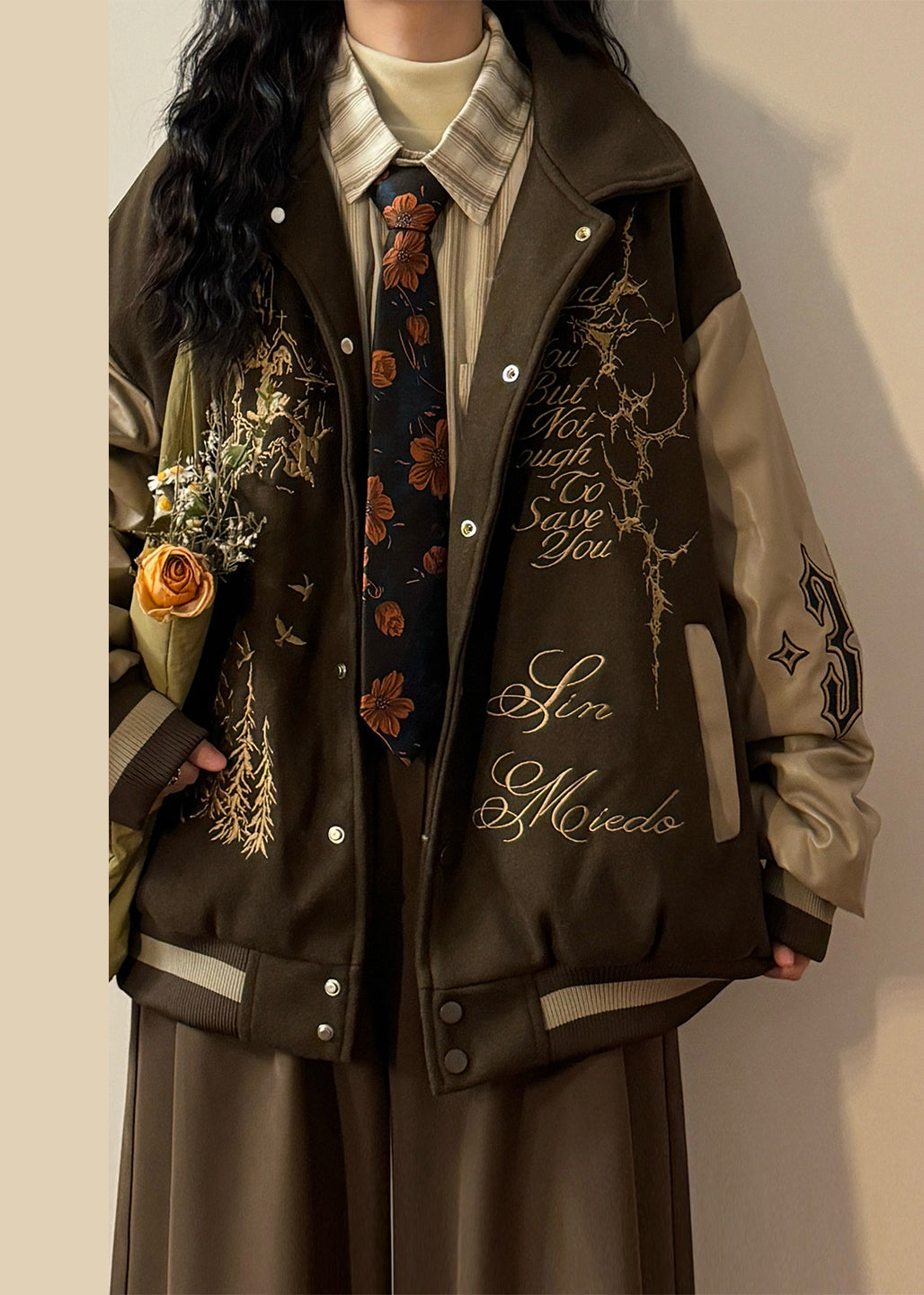 Plus Size Coffee Embroidered Faux Leather Patchwork Cotton Filled Parkas Winter