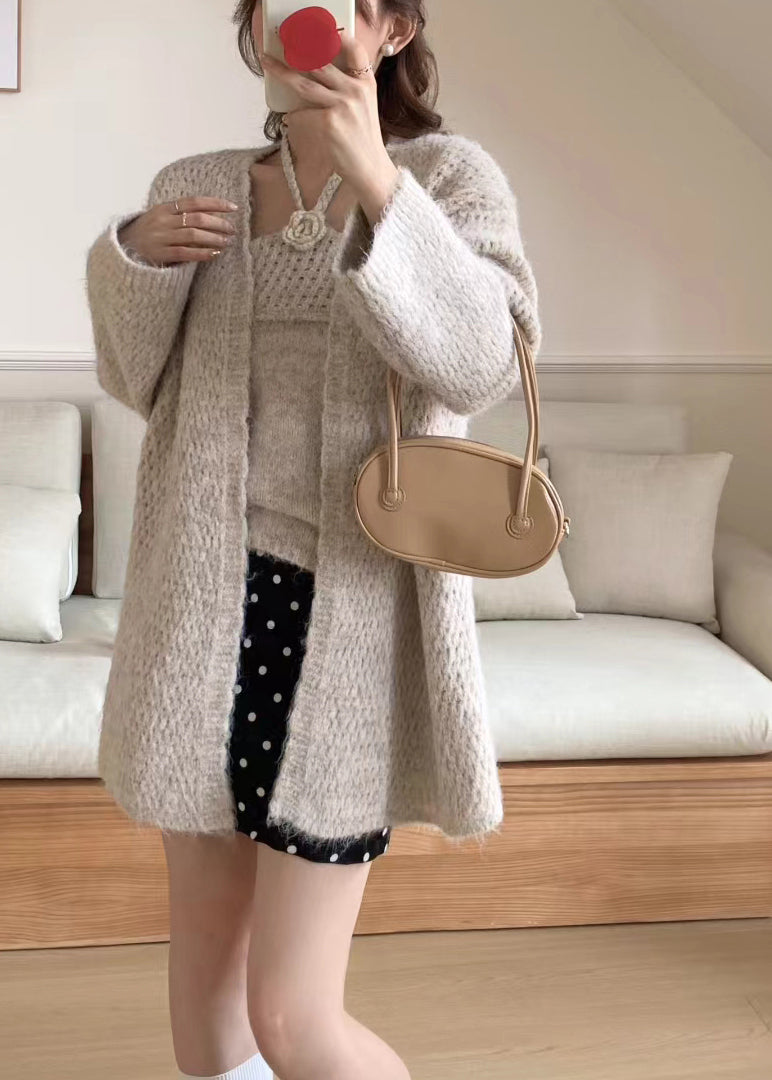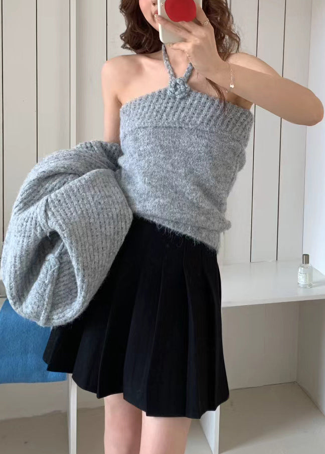 Elegant Grey Halter Floral Knit Cardigan Two Pieces Set Winter