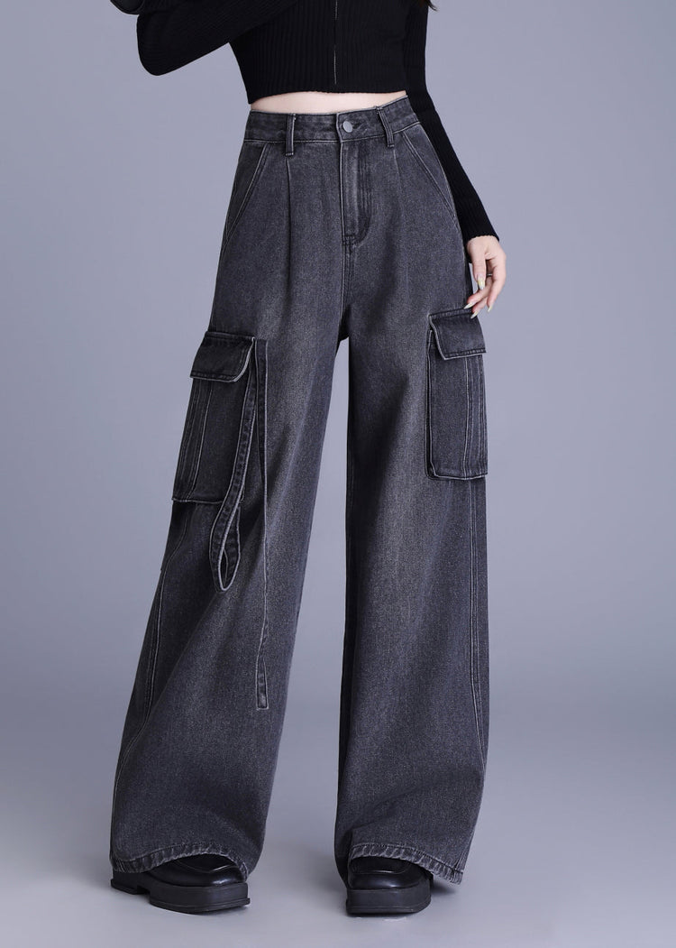 Original Design Black Pockets High Waist Denim Wide Leg Pants Spring