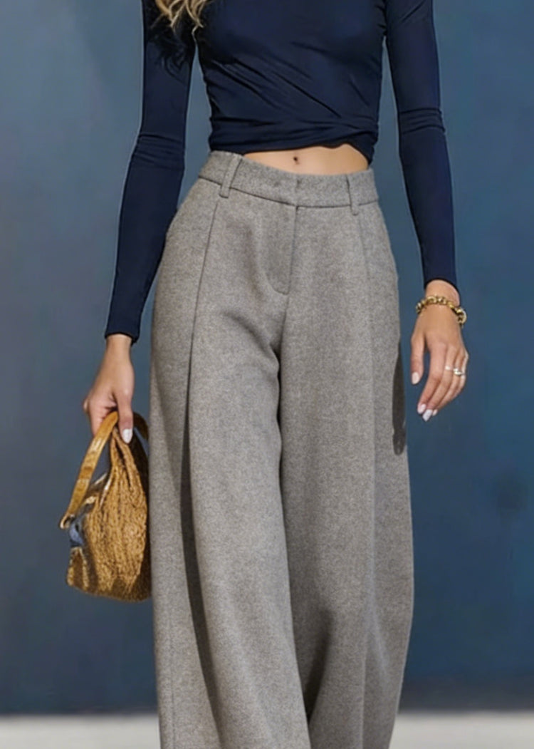 Women Grey Pockets Woolen Wide Leg Pants Spring