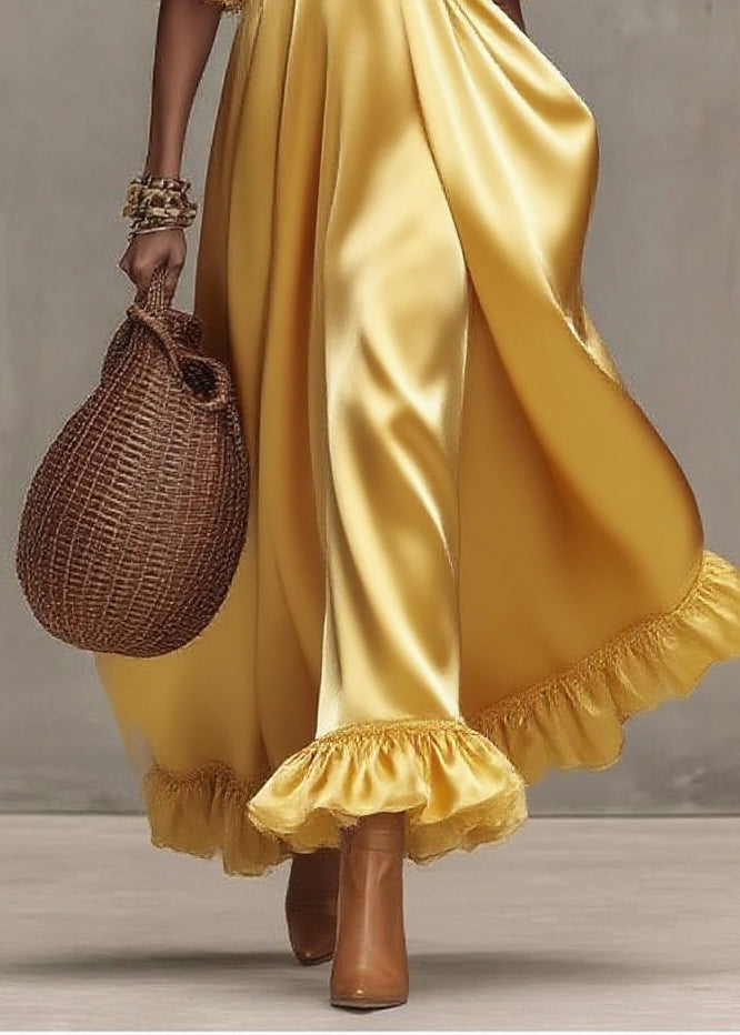Boutique Yellow Sequins Exra Large Hem Silk Long Dress Lantern Sleeve