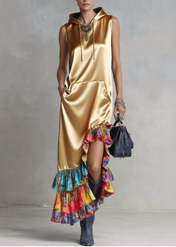 Elegant Golden Asymmetrical Patchwork Ruffles Silk Hooded Dresses Sleeveless