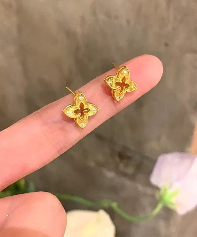 Art Gold Copper Overgild Zircon Floral Hollow Out Stud Earrings