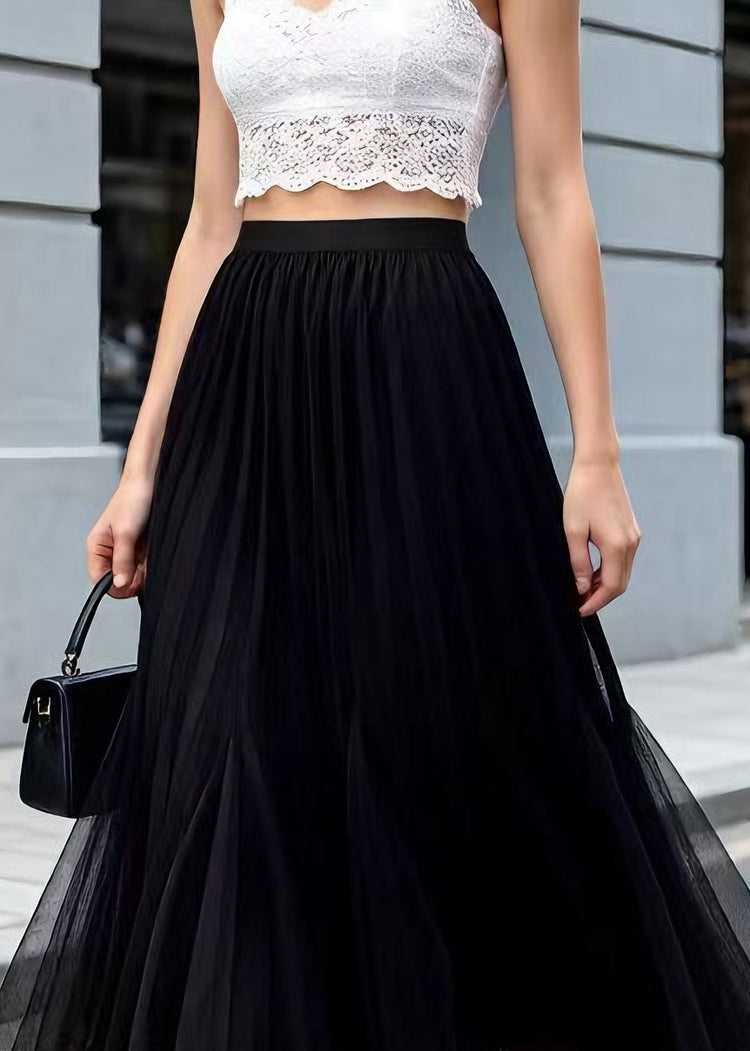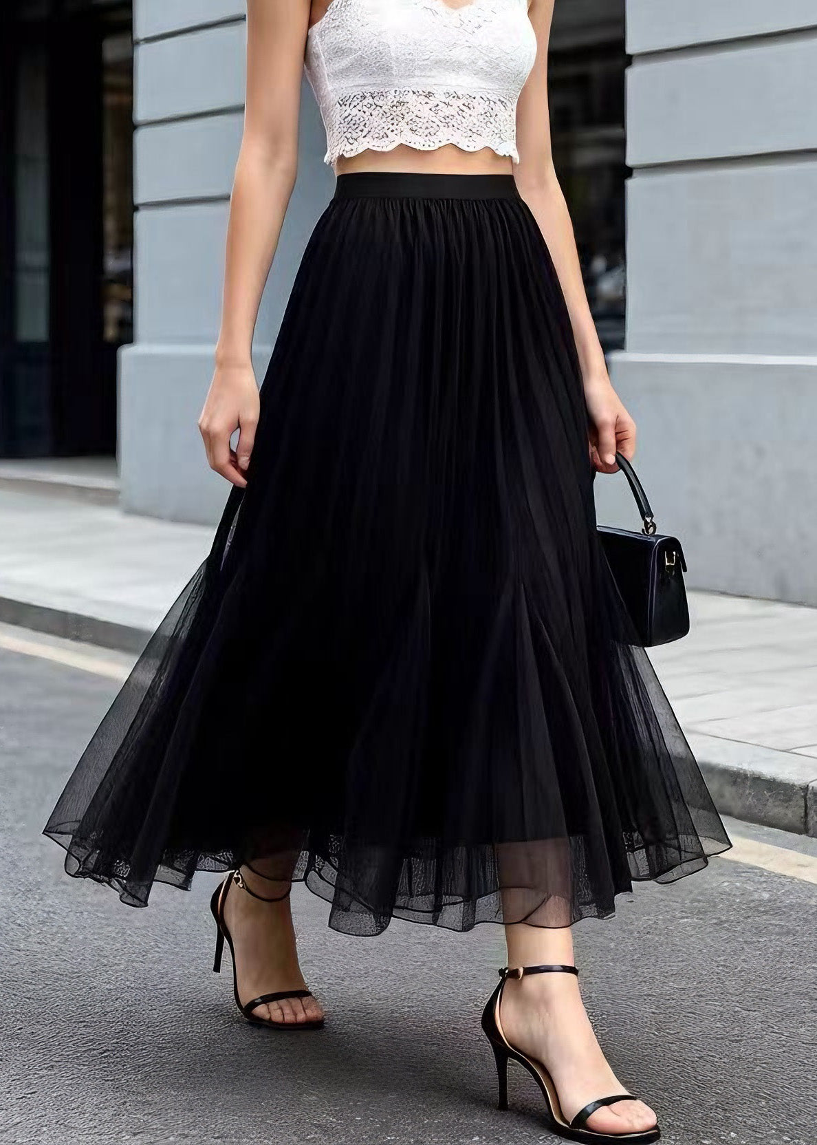 Modern Black Wrinkled Elastic Waist Tulle Skirt Summer